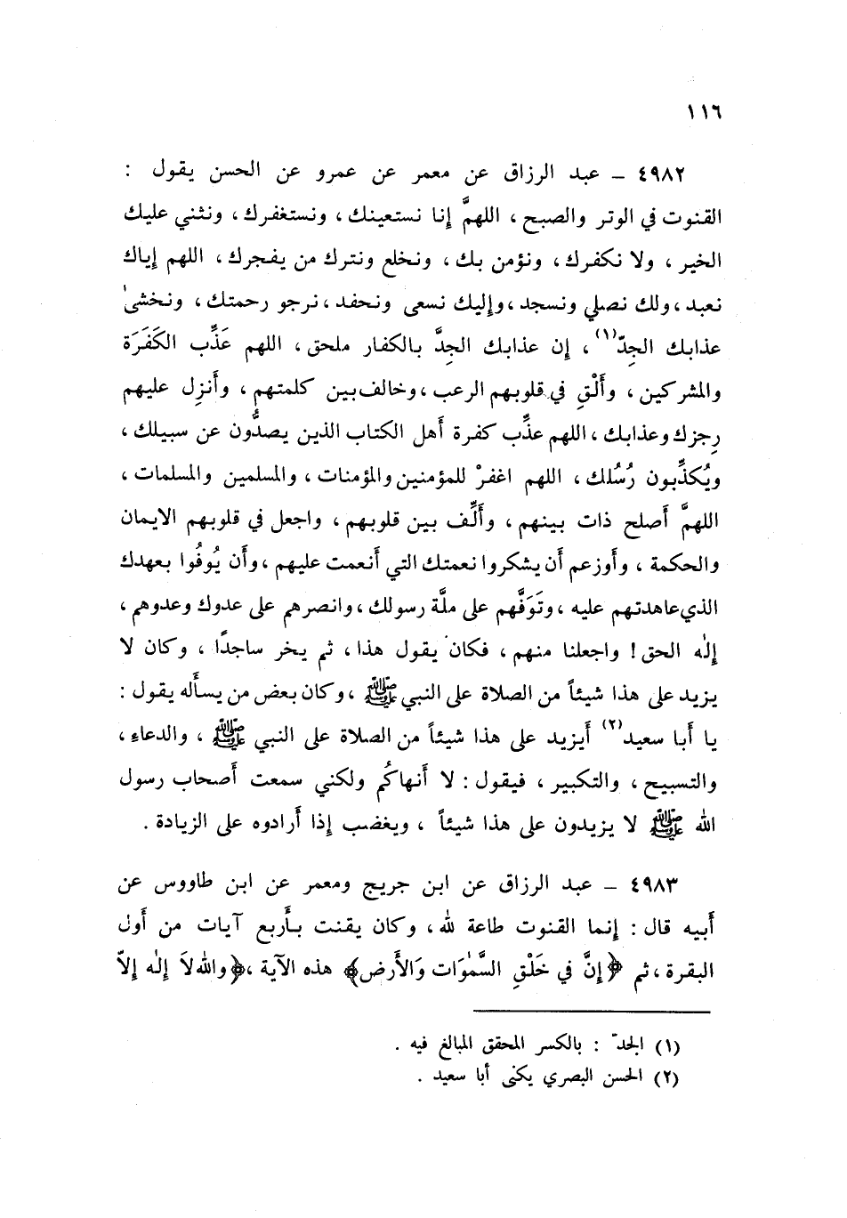 4983 - عَنِ ابْنِ جُرَيْجٍ، وَمَعْمَرٌ، عَنِ ابْنِ طَاوُسٍ، عَنْ أَبِيهِ قَالَ: " إِنَّمَا الْقُنُوتُ طَاعَةٌ لِلَّهِ وَكَانَ §يَقْنُتُ بِأَرْبَعِ آيَاتٍ مِنْ أَوَّلِ الْبَقَرَةِ، ثُمَّ {إِنَّ فِي خَلْقِ السَّمَوَاتِ وَالْأَرْضِ} هَذِهِ الْآيَةَ {اللَّهُ لَا إِلَهُ إِلَّا -[117]- هُوَ الْحَيُّ الْقَيُّومُ} [البقرة: 255] وَهَذِهِ الْآيَةُ {لِلَّهِ مَا فِي السَّمَوَاتِ وَمَا فِي الْأَرْضِ} حَتَّى يَخْتِمَ الْبَقَرَةَ، ثُمَّ قُلْ هُوَ اللَّهُ أَحَدٌ ثُمَّ قُلْ أَعُوذُ بِرَبِّ الْفَلَقِ ثُمَّ قُلْ أَعُوذُ بِرَبِّ النَّاسِ ثُمَّ يَقُولُ: اللَّهُمَّ إِيَّاكَ نَعْبُدُ، وَلَكَ نُصَلِّي وَنَسْجُدُ، وَإِلَيْكَ نَسْعَى وَنَحْفِدُ، نَخْشَى عَذَابَكَ وَنَرْجُو رَحْمَتَكَ، إِنَّ عَذَابَكَ بِالْكَافِرِينَ مُلْحَقٌ، اللَّهُمَّ إِنَّا نَسْتَعِينُكَ: وَنَسْتَغْفِرُكَ، وَنُثْنِي عَلَيْكَ فَلَا نَكْفُرُكَ، وَنُؤْمِنُ بِكَ وَنَخْلَعُ وَنَتْرُكُ مَنْ يَكْفُرُكَ، وَذَكَرُوا أَنَّهَا سُورَتَانِ مِنَ الْبَقَرَةِ، وَأَنَّ مَوْضِعَهُمَا بَعْدَ قُلْ هُوَ اللَّهُ أَحَدٌ " قَالَ ابْنُ جُرَيْجٍ فِي حَدِيثِهِ عَنِ ابْنِ طَاوُسٍ قَالَ: «كَانَ يَقُولُهُمَا أَبِي فِي الصُّبْحِ، وَكَانَ لَا يَجْهَرُ بِهِ، وَكَانَ يَقُولُ هُوَ فِي الظُّهْرِ وَالْعَصْرِ وَالْعِشَاءِ الْآخِرَةِ، فَيَقُولُ فِي الرَّكْعَتَيْنِ الْأُخْرَيَيْنِ مِنَ الظُّهْرِ وَالْعَصْرِ وَالْعِشَاءِ، وَيَقُولُ فِي الرَّكْعَةِ الْأُولَى مِنَ الْأُخْرَيَيْنِ مِنَ الظُّهْرِ مَا فِي الْبَقَرَةِ، وَيَقُولُ فِي الْآخِرَةِ مِنَ الْأُخْرَيَيْنِ مِنَ الظُّهْرِ مَا سِوَى ذَلِكَ، وَكَذَلِكَ فِي الْعَصْرِ وَالْعِشَاءِ الْآخِرَةِ، وَكَانَ يُوتِرُ، وَكَانَ يَجْعَلُ الْقِرَاءَةَ فِي الْوِتْرِ»