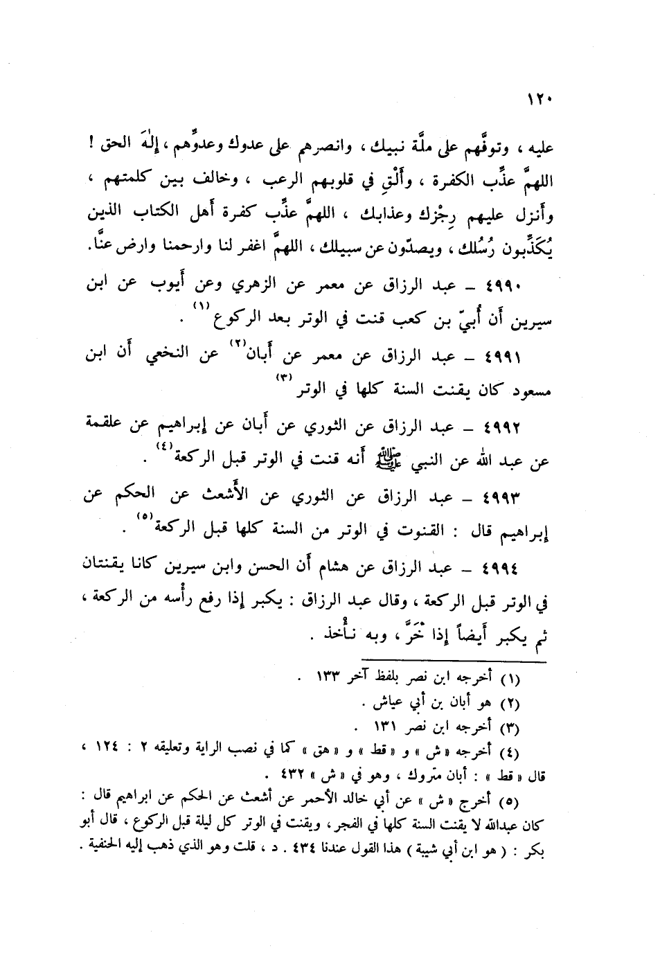 4992 - عَنِ الثَّوْرِيِّ، عَنْ أَبَانَ، عَنْ إِبْرَاهِيمَ، عَنْ عَلْقَمَةَ، عَنْ عَبْدِ اللَّهِ «عَنِ النَّبِيِّ صَلَّى اللهُ عَلَيْهِ وَسَلَّمَ أَنَّهُ §قَنَتَ فِي الْوِتْرِ قَبْلَ الرَّكْعَةِ»