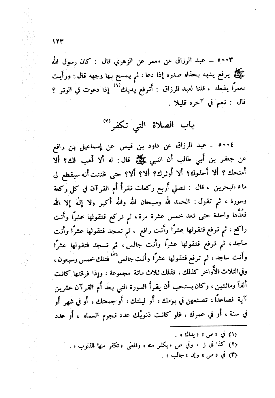 5004 - عَنْ دَاوُدَ بْنِ قَيْسٍ، عَنْ إِسْمَاعِيلَ بْنِ رَافِعٍ، عَنْ جَعْفَرِ بْنِ أَبِي طَالِبٍ أَنَّ النَّبِيَّ صَلَّى اللهُ عَلَيْهِ وَسَلَّمَ قَالَ لَهُ: «أَلَا أَهَبُ لَكَ؟ أَلَا أَمْنَحُكَ؟ أَلَا أَحْذُوكَ؟ أَلَا أُوثِرُكَ؟ أَلَا؟ أَلَا؟» حَتَّى ظَنَنْتُ أَنَّهُ سَيَقْطَعُ لِي مَاءَ الْبَحْرَيْنِ قَالَ: " §تُصَلِّي أَرْبَعَ رَكَعَاتٍ تَقْرَأُ أُمَّ الْقُرْآنِ فِي كُلِّ رَكْعَةٍ وَسُورَةً، ثُمَّ تَقُولُ: الْحَمْدُ لِلَّهُ، وَسُبْحَانَ اللَّهِ، وَاللَّهُ أَكْبَرُ، وَلَا إِلَهَ إِلَّا اللَّهُ، فَعُدَّهَا وَاحِدَةً حَتَّى تعُدَّ خَمْسَ عَشْرَةَ مَرَّةً، ثُمَّ تَرْكَعُ فَتَقُولُهَا عَشْرًا وَأَنْتَ رَاكِعٌ، ثُمَّ تَرْفَعُ فَتَقُولُهَا عَشْرًا وَأَنْتَ رَافِعٌ، ثُمَّ تَسْجُدُ فَتَقُولُهَا عَشْرًا وَأَنْتَ سَاجِدٌ، ثُمَّ تَرْفَعُ فَتَقُولُهَا عَشْرًا وَأَنْتَ جَالِسٌ، ثُمَّ تَسْجُدُ فَتَقُولُهَا عَشْرًا وَأَنْتَ سَاجِدٌ، ثُمَّ تَرْفَعُ فَتَقُولُهَا عَشْرًا وَأَنْتَ جَالِسٌ، فَتِلَكَ خَمْسٌ وَسَبْعُونَ، وَفِي الثَّلَاثِ الْأَوَاخِرِ كَذَلِكَ، فَذَلِكَ ثَلَاثُ مِائَةِ مَجْمُوعَةٍ، وَإِذَا فَرَّقْتَهَا كَانَتْ أَلْفًا وَمِائَتَيْنِ ـ وَكَانَ يَسْتَحِبُّ أَنْ يَقْرَأَ السُّورَةَ الَّتِي بَعْدَ أُمِّ الْقُرْآنِ عِشْرِينَ آيَةً فَصَاعِدًا ـ تَصْنَعُهُنَّ فِي يَوْمِكَ أَوْ لَيْلَتِكَ، أَوْ جَمْعَتِكَ، أَوْ فِي شَهْرٍ، أَوْ فِي سَنَةٍ، أَوْ فِي عُمْرِكَ، فَلَوْ كَانَتْ ذُنُوبُكَ عَدَدَ نُجُومِ السَّمَاءِ، أَوْ عَدَدَ -[124]- الْقَطْرِ، أَوْ عَدَدَ رَمْلِ عَالِجٍ، أَوْ عَدَدَ أَيَّامِ الدَّهْرِ لَغَفَرَهَا اللَّهُ لَكَ "