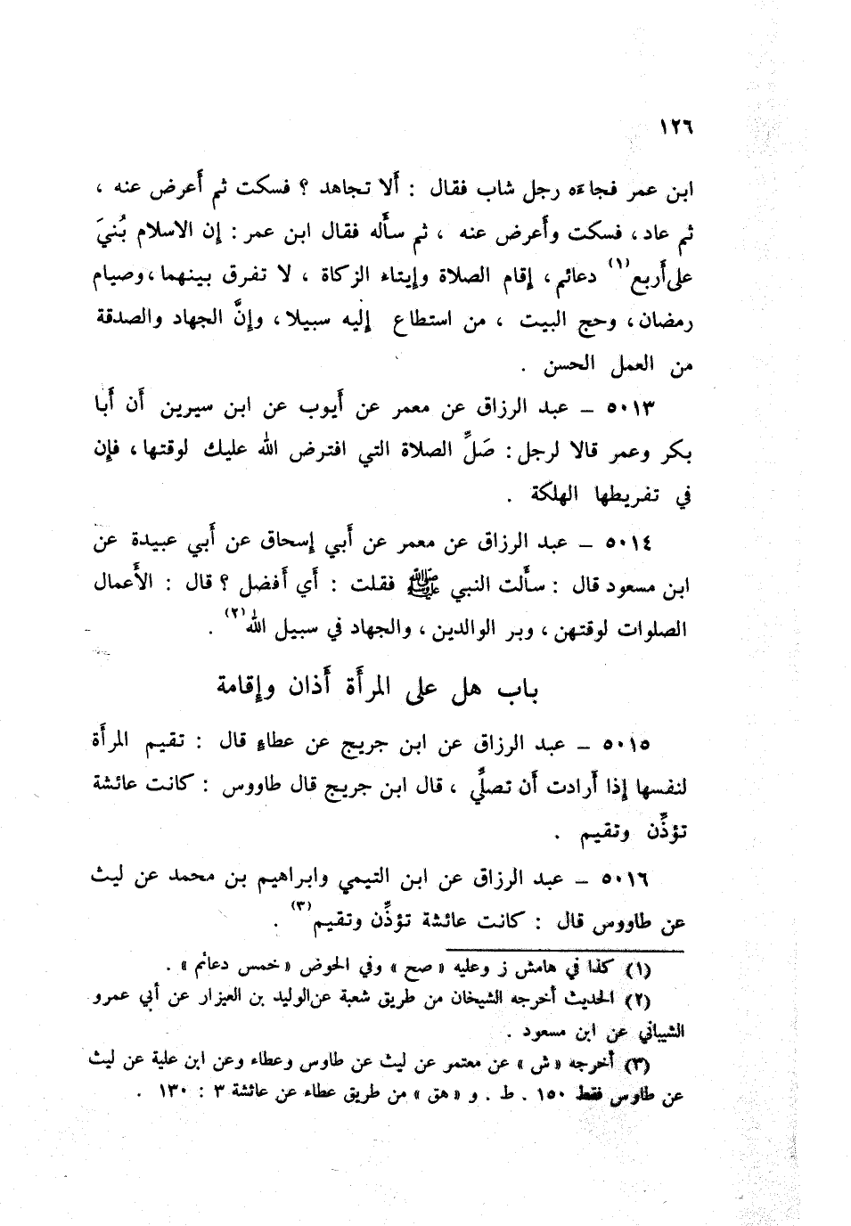5016 - عَنِ ابْنِ التَّيْمِيِّ، وَإِبْرَاهِيمَ بْنِ مُحَمَّدٍ، عَنْ لَيْثٍ، عَنْ طَاوُسٍ قَالَ: «كَانَتْ عَائِشَةُ §تُؤَذِّنَ وَتُقِيمُ»