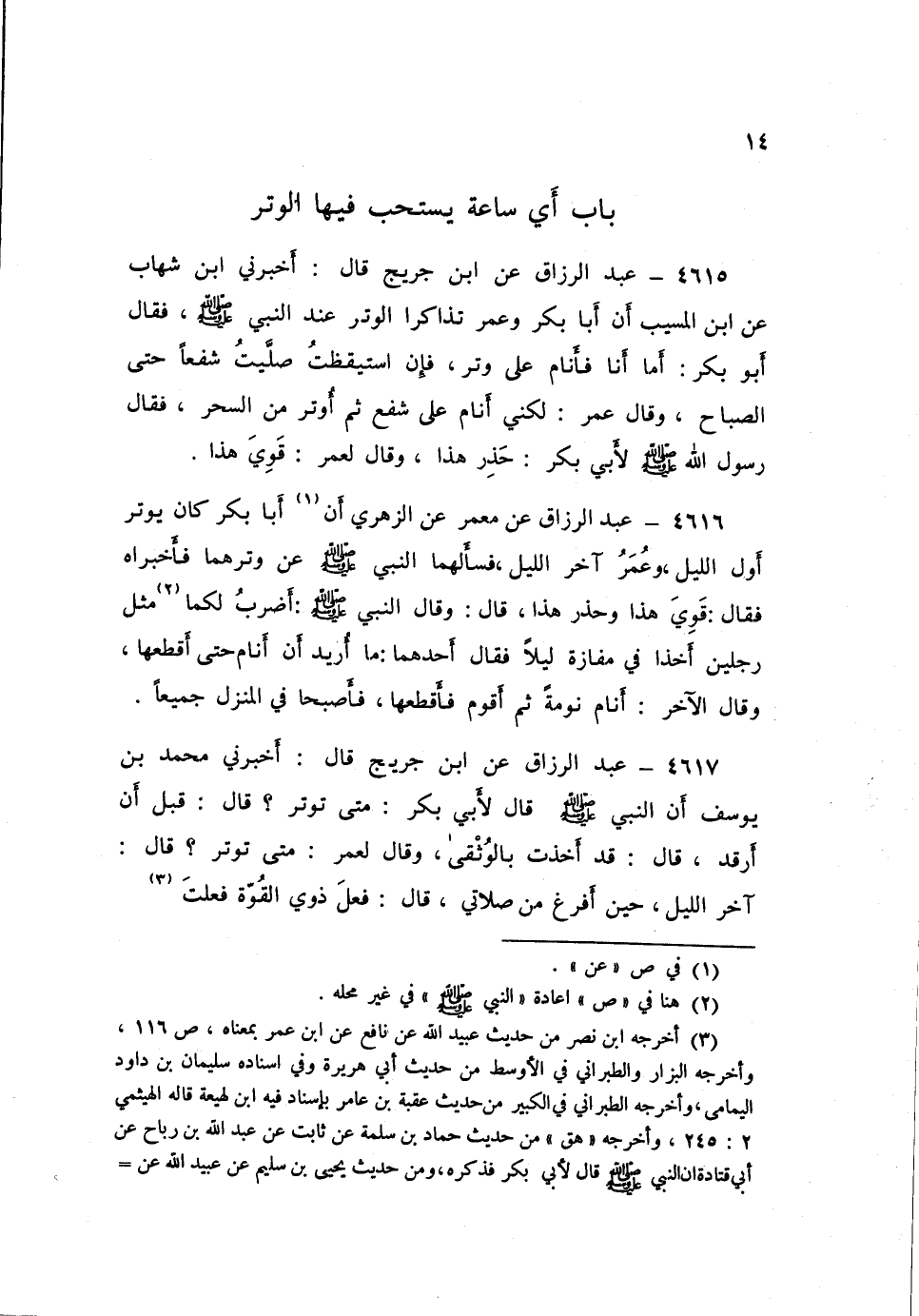 4615 - عَنِ ابْنِ جُرَيْجٍ قَالَ: أَخْبَرَنِي ابْنُ شِهَابٍ، عَنِ ابْنِ الْمُسَيِّبِ: أَنَّ أَبَا بَكْرٍ، وَعُمَرَ §تَذَاكَرَا الْوِتْرَ عِنْدَ النَّبِيِّ صَلَّى اللهُ عَلَيْهِ وَسَلَّمَ، فَقَالَ أَبُو بَكْرٍ: أَمَّا أَنَا فَأَنَامُ عَلَى وِتْرٍ، فَإِنِ اسْتَيْقَظْتُ صَلَّيْتُ شَفْعًا حَتَّى الصَّبَاحِ، وَقَالَ عُمَرُ: لَكِنِّي أَنَامُ عَلَى شَفْعٍ، ثُمَّ أُوتِرُ مِنَ السَّحَرِ، فَقَالَ رَسُولُ اللَّهِ صَلَّى اللهُ عَلَيْهِ وَسَلَّمَ لِأَبِي بَكْرٍ: «حَذِرَ هَذَا» وَقَالَ لِعُمَرَ: «قَوِيَ هَذَا»