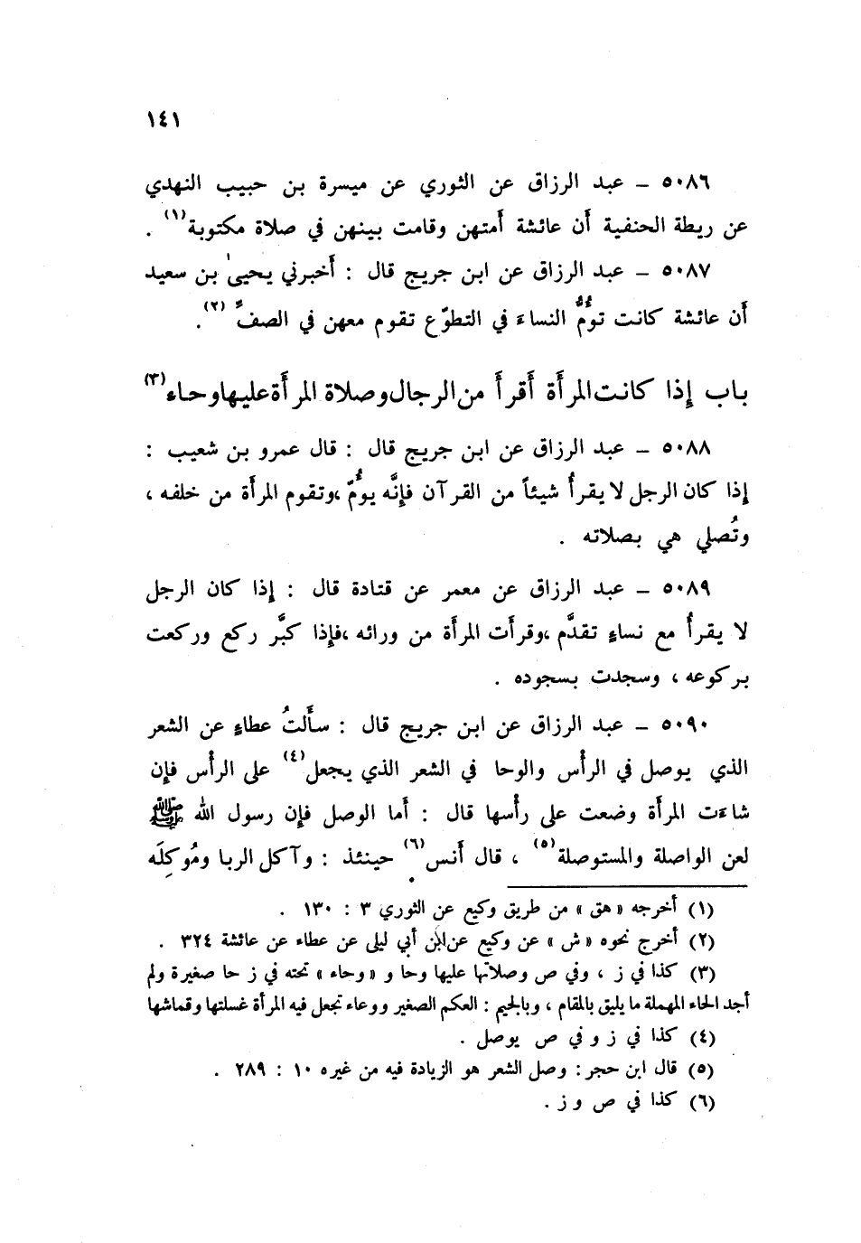 5090 - عَنِ ابْنِ جُرَيْجٍ قَالَ: سَأَلْتُ عَطَاءً، عَنِ الشَّعْرِ الَّذِي يُوصَلُ فِي الرَّأْسِ وَالْوَحَا فِي الشَّعْرِ الَّذِي يُجْعَلُ عَلَى الرَّأْسِ؟ «فَإِنْ شَاءَتِ الْمَرْأَةُ وَضَعَتْ عَلَى رَأْسِهَا» قَالَ: أَمَّا الْوَصْلُ فَإِنَّ رَسُولَ اللَّهِ صَلَّى اللهُ عَلَيْهِ وَسَلَّمَ «§لَعَنَ الْوَاصِلَةَ وَالْمُسْتَوْصِلَةَ» قَالَ أَنَسٌ حِينَئِذٍ: وَآكِلَ الرِّبَا، وَمُوكِلَهُ -[142]-، وَالشَّاهِدَ، وَالْكَاتِبَ، وَالْوَاشِمَةَ، وَالْمُسْتَوْشِمَةَ، وَالْعَاضِهَةَ، وَالْمُسْتَعْضِهَةَ، قَالَ عَطَاءٌ: «قَدْ سَمِعْنَا ذَلِكَ» قَالَ: وَكُنَّ نِسَاءَ الْعَرَبِ يَشِمْنَ أَيْدِيَهُنَّ قَالَ: «وَأَمَّا هَاتَيْنِ فَهُوَ شَيْءٌ أَحْدَثْتُمُوهُ، وَلَكِنْ لَمْ يَكُنْ عَلَى عَهْدِ النَّبِيِّ صَلَّى اللهُ عَلَيْهِ وَسَلَّمَ فَلْتَضَعْهُ الْمَرْأَةُ عِنْدَ الصَّلَاةِ»، قُلْتُ: أَرَأَيْتَ كُلَّ وَشْمٍ تَزِيدُ بِهِ الْمَرْأَةُ حُسْنًا؟ قَالَ: «لَا خَيْرَ فِيهِ»، قُلْتُ: وَشْمُهَا شَفَتَيْهَا ثُمَّ تُسِفُّهَا إِثْمِدًا؟ قَالَ: «لَا خَيْرَ فِيهِ»