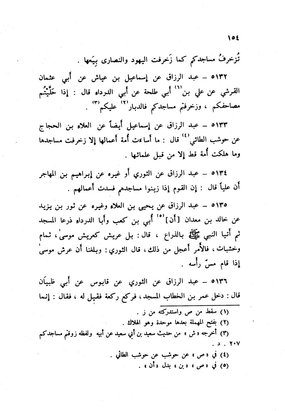 5133 - عَنْ إِسْمَاعِيلَ، أَيْضًا، عَنِ الْعَلَاءِ بْنِ الْحَجَّاجِ، عَنْ حَوْشَبٍ الطَّائِيِّ قَالَ: «§مَا أَسَاءَتْ أُمَّةٌ أَعْمَالَهَا إِلَّا زَخْرَفَتْ مَسَاجِدَهَا، وَمَا هَلَكَتْ أُمَّةٌ قَطُّ إِلَّا مِنْ قِبَلِ عُلَمَائِهَا»