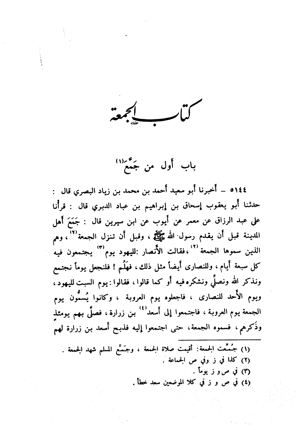 5144 - أَخْبَرَنَا أَبُو سَعِيدٍ أَحْمَدُ بْنُ مُحَمَّدِ بْنِ زِيَادٍ الْبَصْرِيُّ قَالَ: حَدَّثَنَا أَبُو يَعْقُوبَ إِسْحَاقُ بْنُ إِبْرَاهِيمَ بْنِ عَبَّادٍ الدَّبَرِيُّ قَالَ: قَرَأْنَا عَلَى عَبْدِ الرَّزَّاقِ، عَنْ مَعْمَرٍ، عَنْ أَيُّوبَ، عَنِ ابْنِ سِيرِينَ قَالَ: " §جَمَّعَ أَهْلُ الْمَدِينَةِ قَبْلَ أَنْ يُقْدِمَ رَسُولُ اللَّهِ صَلَّى اللهُ عَلَيْهِ وَسَلَّمَ وَقَبْلَ أَنْ تَنْزِلَ الْجُمُعَةُ وَهُمُ الَّذِينَ سَمَّوْهَا الْجُمُعَةَ، فَقَالَتِ الْأَنْصَارُ لِلْيَهُودِ: يَوْمٌ يَجْتَمِعُونَ فِيهِ كُلَّ سَبْعَةِ أَيَّامٍ، وَلِلنَّصَارَى أَيْضًا مِثْلُ ذَلِكَ، فَهَلُمَّ فَلْنَجْعَلْ يَوْمًا نَجْتَمِعُ وَنَذْكُرُ اللَّهَ وَنُصَلِّي وَنَشْكُرُهُ فِيهِ، أَوْ كَمَا قَالُوا: فَقَالُوا: يَوْمُ السَّبِتِ لِلْيَهُودِ، وَيَوْمُ الْأَحَدِ لِلنَّصَارَى، فَاجْعَلُوهُ يَوْمَ الْعُرُوبَةِ، وَكَانُوا يُسَمُّونَ يَوْمَ الْجُمُعَةِ يَوْمَ الْعُرُوبَةِ، فَاجْتَمَعُوا إِلَى أَسْعَدَ بْنِ زُرَارَةَ فَصَلَّى بِهِمْ، يَوْمَئِذٍ وَذَكَّرَهُمْ فَسَمَّوْهُ الْجُمُعَةَ، حَتَّى اجْتَمَعُوا إِلَيْهِ، فَذبَحَ أَسْعَدُ بْنُ زُرَارَةَ لَهمُ -[160]- شَاةً فَتَغَدَّوْا وَتَعَشَّوْا مِنْ شَاةٍ وَاحِدَةٍ، وَذَلِكَ لِقِلَّتِهِمْ "، فَأَنْزَلَ اللَّهُ فِي ذَلِكَ بَعْدَ ذَلِكَ: {إِذَا نُودِيَ لِلصَّلَاةِ مِنْ يَوْمِ الْجُمُعَةِ فَاسْعَوْا إِلَى ذِكْرِ اللَّهِ} [الجمعة: 9]