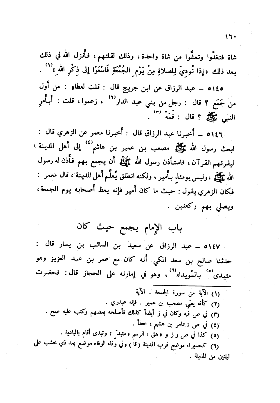 5146 - عَبْدُ الرَّزَّاقِ، أَخْبَرَنَا مَعْمَرٌ، عَنِ الزُّهْرِيِّ قَالَ: «بَعَثَ رَسُولُ اللَّهِ صَلَّى اللهُ عَلَيْهِ وَسَلَّمَ مُصْعَبَ بْنَ عُمَيْرِ بْنِ هَاشِمٍ إِلَى أَهْلِ الْمَدِينَةِ لِيُقْرِئَهُمُ الْقُرْآنَ، فَاسْتَأْذَنَ رَسُولَ اللَّهِ صَلَّى اللهُ عَلَيْهِ وَسَلَّمَ أَنْ يُجَمِّعَ بِهِمْ، §فَأَذِنَ لَهُ رَسُولُ اللَّهِ صَلَّى اللهُ عَلَيْهِ وَسَلَّمَ وَلَيْسَ يَوْمَئِذٍ بِأَمِيرٍ، وَلَكِنَّهُ انْطَلَقَ يُعَلِّمُ أَهْلَ الْمَدِينَةِ»، قَالَ مَعْمَرٌ: فَكَانَ الزُّهْرِيُّ يَقُولُ: حَيْثُمَا كَانَ أَمِيرٌ، فَإِنَّهُ يَعِظُّ أَصْحَابَهُ يَوْمَ الْجُمُعَةِ، وَيُصَلِّي بِهِمْ رَكْعَتَيْنِ
