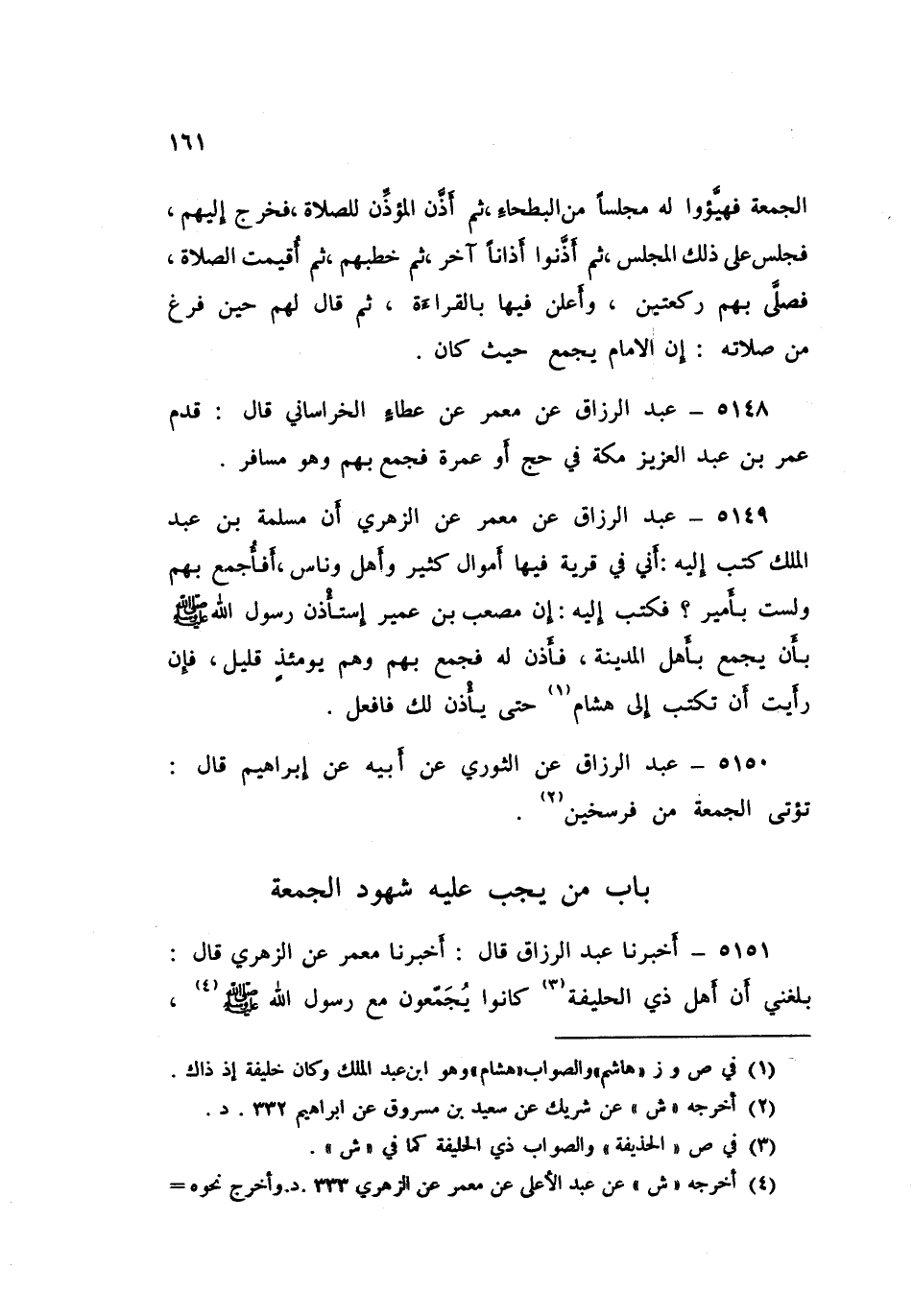 5151 - عَبْدُ الرَّزَّاقِ، قَالَ: أَخْبَرَنَا مَعْمَرٌ، عَنِ الزُّهْرِيِّ قَالَ: «§بَلَغَنِي أَنَّ أَهْلَ ذِي الْحُلَيْفَةِ كَانُوا يُجَمِّعُونَ مَعَ رَسُولِ اللَّهِ صَلَّى اللهُ عَلَيْهِ وَسَلَّمَ»، قَالَ الزُّهْرِيُّ: وَذَلِكَ سِتَّةَ أَمْيَالٍ، قَالَ مَعْمَرٌ، وَقَالَ قَتَادَةُ، فَرْسَخَيْنِ