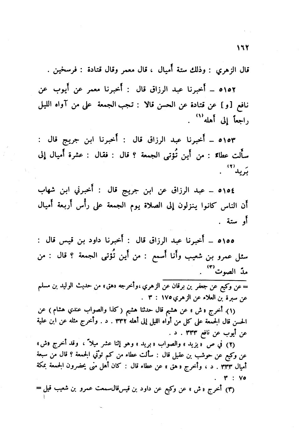 5154 - عَنِ ابْنِ جُرَيْجٍ قَالَ: أَخْبَرَنِي ابْنُ شِهَابٍ «أَنَّ §النَّاسَ كَانُوا يَنْزِلُونَ إِلَى الصَّلَاةِ يَوْمَ الْجُمُعَةِ عَلَى رَأْسِ أَرْبَعَةِ أَمْيَالٍ أَوْ سِتَّةٍ»
