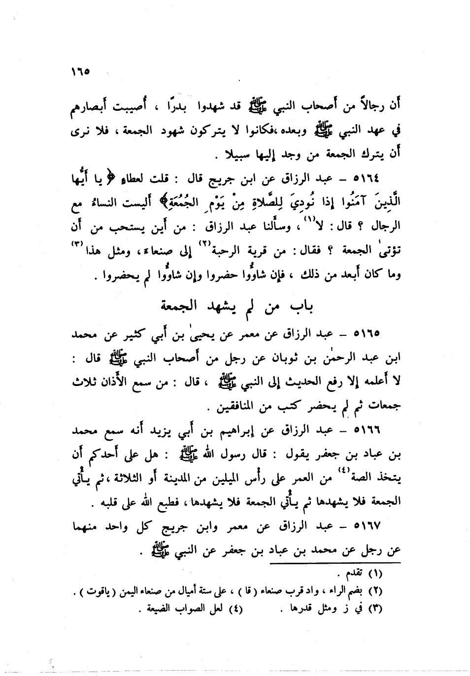 5165 - عَنْ مَعْمَرٍ، عَنْ يَحْيَى بْنِ أَبِي كَثِيرٍ، عَنْ مُحَمَّدِ بْنِ عَبْدِ الرَّحْمَنِ بْنِ ثَوْبَانَ، عَنْ رَجُلٍ مِنْ أَصْحَابِ النَّبِيِّ صَلَّى اللهُ عَلَيْهِ وَسَلَّمَ قَالَ: لَا أَعْلَمُهُ إِلَّا رَفَعَ الْحَدِيثَ إِلَى النَّبِيِّ صَلَّى اللهُ عَلَيْهِ وَسَلَّمَ قَالَ: «§مَنْ سَمِعَ الْأَذَانَ ثَلَاثَ جُمُعَاتٍ ثُمَّ لَمْ يَحْضُرْ كُتِبَ مِنَ الْمُنَافِقِينَ»