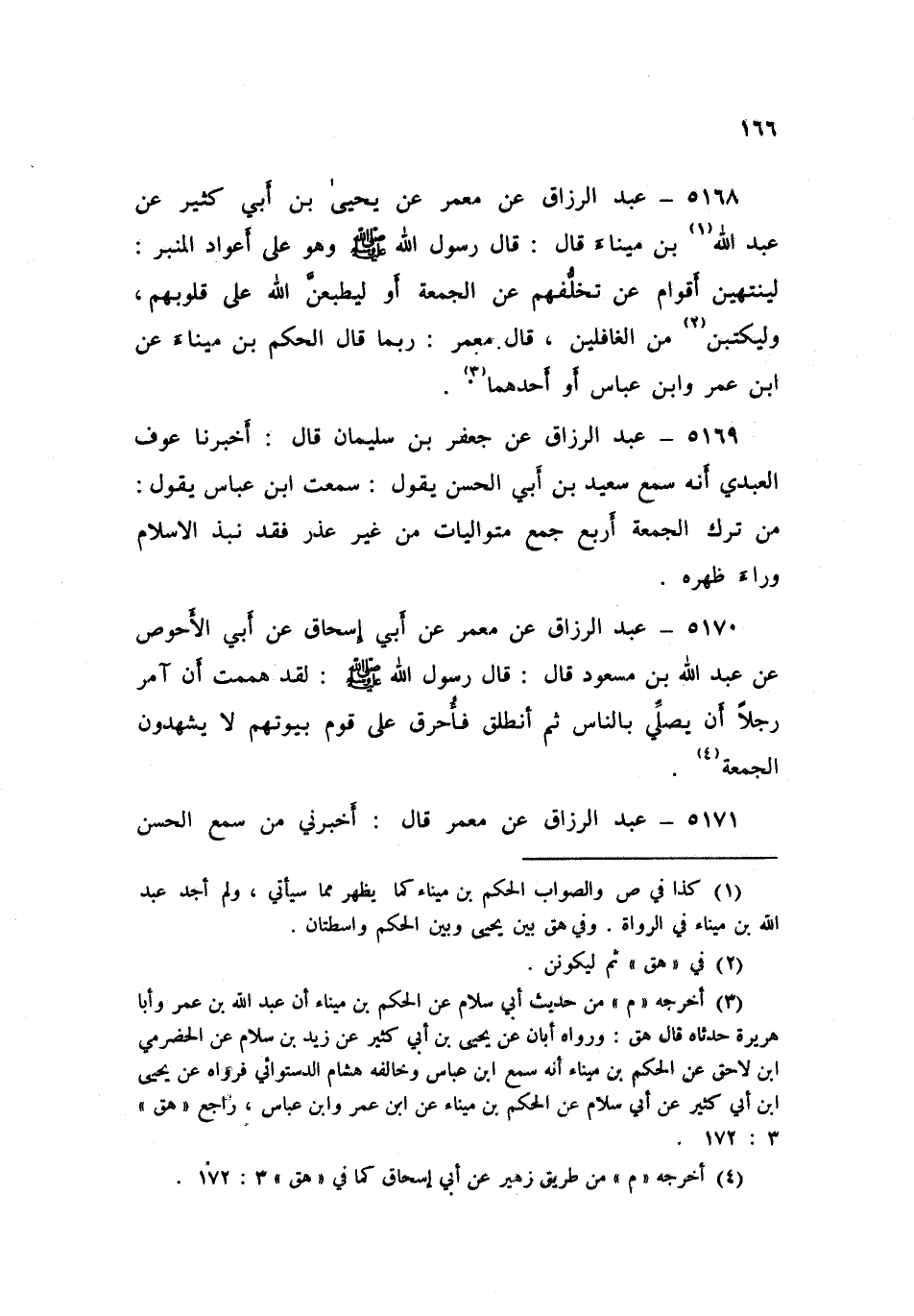 5170 - عَنْ مَعْمَرٍ، عَنْ أَبِي إِسْحَاقَ، عَنْ أَبِي الْأَحْوَصِ، عَنْ عَبْدِ اللَّهِ بْنِ مَسْعُودٍ قَالَ: قَالَ رَسُولُ اللَّهِ صَلَّى اللهُ عَلَيْهِ وَسَلَّمَ: «§لَقَدْ هَمَمْتُ أَنْ آمُرَ رَجُلًا أَنْ يُصَلِّيَ بِالنَّاسِ، ثُمَّ أَنْطَلِقُ فَأَحْرِقُ عَلَى قَوْمٍ بُيُوتَهُمْ لَا يَشْهَدُونَ الْجُمُعَةَ»