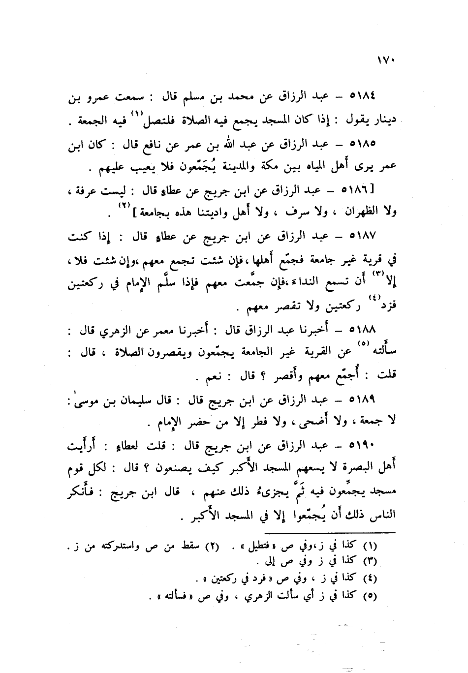 5190 - عَنِ ابْنِ جُرَيْجٍ قَالَ: قُلْتُ لِعَطَاءٍ: أَرَأَيْتَ أَهْلَ الْبَصْرَةِ لَا يَسَعُهُمُ الْمَسْجِدُ الْأَكْبَرُ كَيْفَ يَصْنَعُونَ؟ قَالَ: «§لِكُلِّ قَوْمٍ مَسْجِدٌ يُجَمِّعُونَ فِيهِ، ثُمَّ يُجْزِئُ ذَلِكَ عَنْهُمْ»، قَالَ ابْنُ جُرَيْجٍ: فَأَنْكَرَ النَّاسُ ذَلِكَ أَنْ يُجَمِّعُوا إِلَّا فِي الْمَسْجِدِ الْأَكْبَرِ