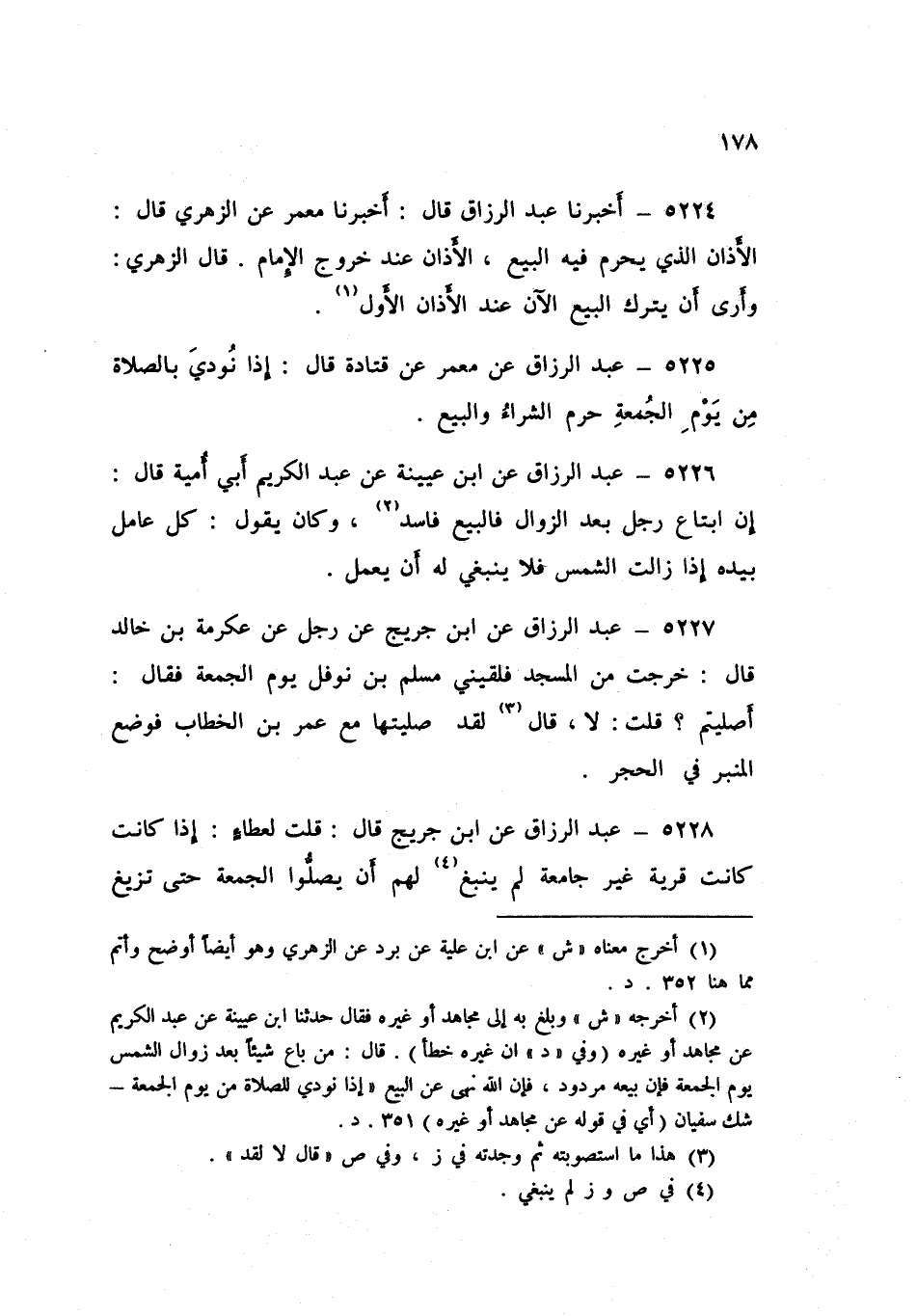 5224 - عَبْدُ الرَّزَّاقِ، أَخْبَرَنَا مَعْمَرٌ، عَنِ الزُّهْرِيِّ قَالَ: «§الْأَذَانُ الَّذِي يَحْرُمُ فِيهِ الْبَيْعُ الْأَذَانُ عِنْدَ خُرُوجِ الْإِمَامِ» قَالَ الزُّهْرِيُّ: «وَأَرَى أَنْ يَتْرُكَ الْبَيْعَ الْآنَ عِنْدَ الْأَذَانِ الْأَوَّلِ»