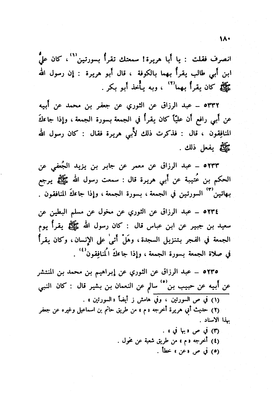 5233 - عَنْ مَعْمَرٍ، عَنْ جَابِرِ بْنِ يَزِيدَ الْجُعْفِيِّ، عَنِ الْحَكَمِ بْنِ عُتَيْبَةَ، عَنْ أَبِي هُرَيْرَةَ قَالَ: «سَمِعْتُ رَسُولَ اللَّهِ صَلَّى اللهُ عَلَيْهِ وَسَلَّمَ §يُرَجِّعُ بِهَاتَيْنِ السُّورَتَيْنِ فِي الْجُمُعَةِ بِسُورَةِ الْجُمُعَةِ وَإِذَا جَاءَكَ الْمُنَافِقُونَ»