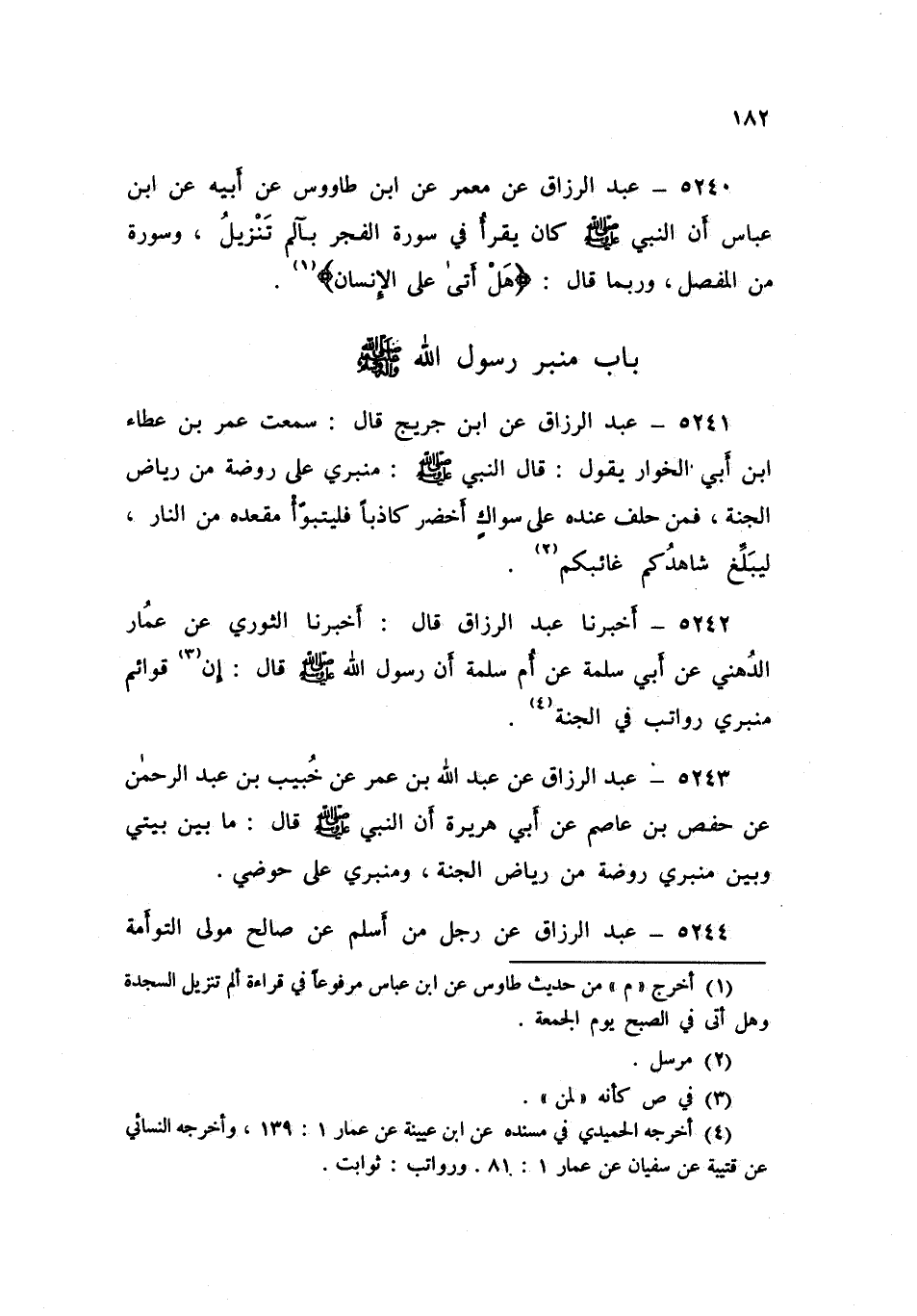 5242 - عَبْدُ الرَّزَّاقِ، قَالَ: أَخْبَرَنَا الثَّوْرِيُّ، عَنْ عَمَّارٍ الدُّهْنِيِّ، عَنْ أَبِي سَلَمَةَ، عَنْ أُمِّ سَلَمَةَ، أَنَّ رَسُولَ اللَّهِ صَلَّى اللهُ عَلَيْهِ وَسَلَّمَ قَالَ: «إِنَّ §قَوَائِمَ مِنْبَرِي رَوَاتِبُ فِي الْجَنَّةِ»