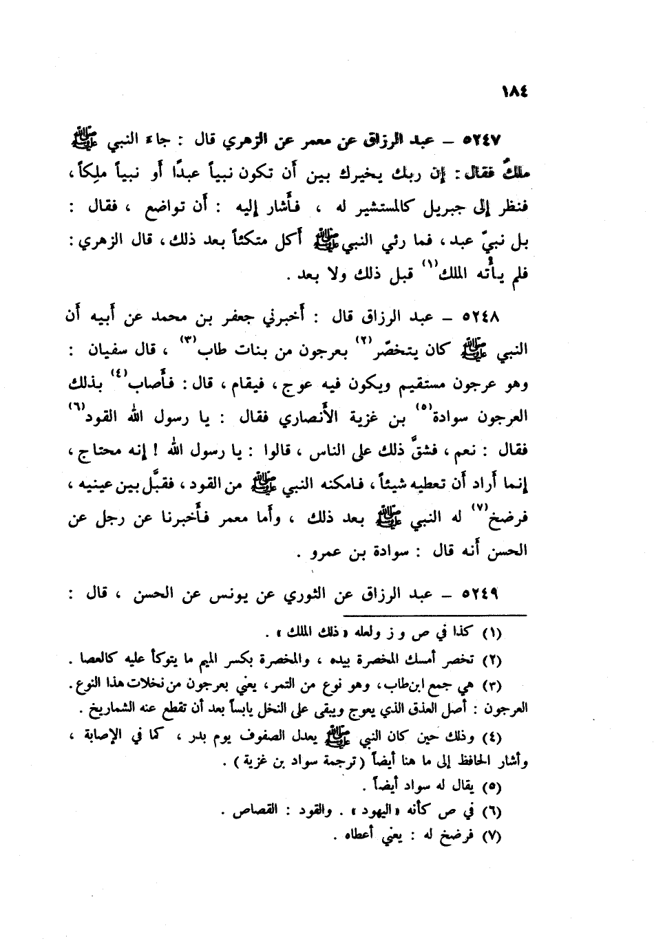 5248 - عَبْدُ الرَّزَّاقِ، أَخْبَرَنِي جَعْفَرُ بْنُ مُحَمَّدٍ، عَنْ أَبِيهِ، أَنَّ النَّبِيَّ صَلَّى اللهُ عَلَيْهِ وَسَلَّمَ كَانَ يَتَخَصَّرُ بِعُرْجُونٍ مِنْ بَنَاتِ طَابٍ، قَالَ سُفْيَانُ: وَهُوَ عُرْجُونٌ مُسْتَقِيمٌ، وَيَكُونُ فِيهِ عِوَجٌ فَيُقَامُ قَالَ: فَأَصَابَ بِذَلِكَ الْعُرْجُونِ سَوَادَةَ بْنَ غَزِيَّةَ الْأَنْصَارِيَّ، فَقَالَ: يَا رَسُولَ اللَّهِ، الْقَوَدُ، فَقَالَ: «§نَعَمْ» فَشَقَّ ذَلِكَ عَلَى النَّاسِ قَالُوا: يَا رَسُولَ اللَّهِ، إِنَّهُ مُحْتَاجٌ إِنَّمَا أَرَادَ أَنْ تُعْطِيَهُ شَيْئًا، فَأَمْكَنَهُ النَّبِيُّ صَلَّى اللهُ عَلَيْهِ وَسَلَّمَ مِنَ الْقَوَدِ فَقَبَّلَ بَيْنَ عَيْنَيْهِ، فَرَضَخَ لَهُ النَّبِيُّ صَلَّى اللهُ عَلَيْهِ وَسَلَّمَ بَعْدَ ذَلِكَ، وَأَمَّا مَعْمَرٌ فَأَخْبَرَنَا عَنْ رَجُلٍ، عَنِ الْحَسَنِ أَنَّهُ قَالَ: سَوَادَةُ بْنُ عَمْرٍو