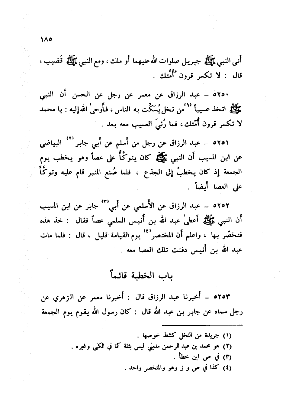 5253 - أَخْبَرَنَا عَبْدُ الرَّزَّاقِ قَالَ: أَخْبَرَنَا مَعْمَرٌ، عَنِ الزُّهْرِيِّ، عَنْ رَجُلٍ، سَمَّاهُ، عَنْ جَابِرِ بْنِ عَبْدِ اللَّهِ قَالَ: كَانَ رَسُولُ اللَّهِ صَلَّى اللهُ عَلَيْهِ وَسَلَّمَ §يَقُومُ يَوْمَ الْجُمُعَةِ -[186]- إِلَى جِذْعِ نَخْلَةٍ مَنْصُوبٍ فِي الْمَسْجِدِ فَيَخْطُبُ، حَتَّى بَدَا لَهُ أَنْ يَتَّخِذَ الْمِنْبَرَ، فَاسْتَشَارَ ذَوِي الرَّأْيِ مِنَ الْمُسْلِمِينَ فَرَأَوْا أَنْ يَتَّخِذَهُ، فَاتَّخَذَ مِنْبَرًا، فَلَمَّا جَاءَتِ الْجُمُعَةُ، أَقْبَلَ النَّبِيُّ صَلَّى اللهُ عَلَيْهِ وَسَلَّمَ، يَمْشِي حَتَّى جَلَسَ عَلَى الْمِنْبَرِ، فَلَمَّا فَقَدَهُ الْجِذْعُ حَنَّ حَنِينًا أَفْزَعَ النَّاسَ، فَقَامَ النَّبِيُّ صَلَّى اللهُ عَلَيْهِ وَسَلَّمَ مِنْ مَجْلِسِهِ، حَتَّى جَاءَهُ فَقَامَ إِلَيْهِ فَمَسَحَهُ فَهَدَأَ فَلَمْ يُسْمَعْ مِنْهُ حَنِينٌ بَعْدَ ذَلِكَ. قَالَ مَعْمَرٌ: وَسَمِعْتُ مَنْ يَقُولُ: فَلَوْلَا مَا فَعَلَ بِهِ رَسُولُ اللَّهِ صَلَّى اللهُ عَلَيْهِ وَسَلَّمَ حَنَّ إِلَى يَوْمِ الْقِيَامَةِ