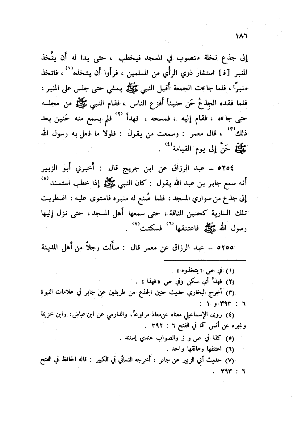 5254 - عَنِ ابْنِ جُرَيْجٍ قَالَ: أَخْبَرَنِي أَبُو الزُّبَيْرِ، أَنَّهُ سَمِعَ جَابِرَ بْنَ عَبْدِ اللَّهِ يَقُولُ: «كَانَ النَّبِيُّ صَلَّى اللهُ عَلَيْهِ وَسَلَّمَ §إِذَا خَطَبَ اسْتَسْنَدَ إِلَى جِذْعٍ مِنْ سَوَارِي الْمَسْجِدِ، فَلَمَّا صُنِعَ لَهُ مِنْبَرُهُ فَاسْتَوَى عَلَيْهِ اضْطَرَبَتْ تِلْكَ السَّارِيَةُ كَحَنِينِ النَّاقَةِ حَتَّى سَمِعَهَا أَهْلُ الْمَسْجِدِ حَتَّى نَزَلَ إِلَيْهَا رَسُولُ اللَّهِ صَلَّى اللهُ عَلَيْهِ وَسَلَّمَ» فَاعْتَنَقَهَا فَسَكَتَتْ "