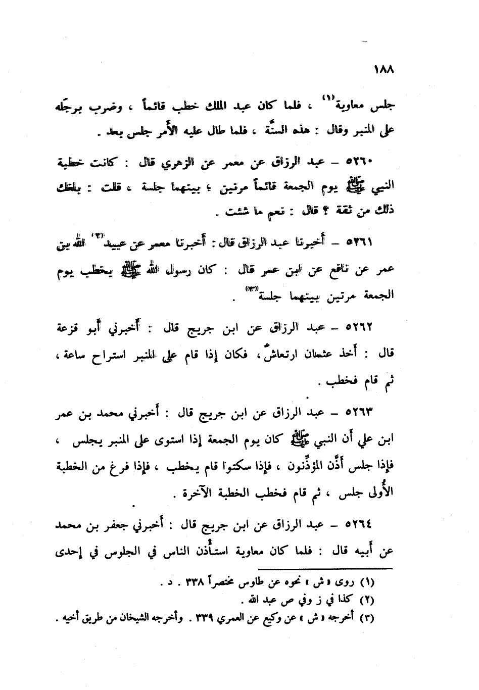 5265 - عَنِ ابْنِ جُرَيْجٍ قَالَ: «§مَا جَلَسَ النَّبِيُّ صَلَّى اللهُ عَلَيْهِ وَسَلَّمَ عَلَى مِنْبَرٍ حَتَّى مَاتَ، مَا كَانَ يَخْطُبُ إِلَّا قَائِمًا، فَكَمْ تُحِبُّونَ أَنْ يُحِسَّ النَّاسُ إِنَّمَا كَانَ النَّبِيُّ صَلَّى اللهُ عَلَيْهِ وَسَلَّمَ، وَأَبُو بَكْرٍ، وَعُمَرُ، وَعُثْمَانُ، يَرْتَقِي أَحَدُهُمْ عَلَى الْمِنْبَرِ، فَيَقُومُ هُوَ قَائِمًا لَا يَجْلِسُ عَلَى الْمِنْبَرِ حَتَّى يَرْتَقِيَ عَلَيْهِ، وَلَا يَجْلِسُ عَلَيْهِ بَعْدُ حَتَّى يَنْزِلَ، وَإِنَّمَا خُطْبَتُهُ جَمِيعًا، وَهُوَ قَائِمٌ وَإِنَّمَا كَانُوا يَتَشَهَّدُونَ مَرَّةً وَاحِدَةً الْأُولَى، وَلَمْ يَكُنْ مِنْبَرٌ إِلَّا مِنْبَرُ النَّبِيِّ صَلَّى اللهُ عَلَيْهِ وَسَلَّمَ حَتَّى قَدِمَ مُعَاوِيَةُ إِذْ حَجَّ بِمِنْبَرِهِ فَتَرَكَهُ فَلَمْ يَزَالُوا يَخْطُبُونَ عَلَى الْمَنَابِرِ»
