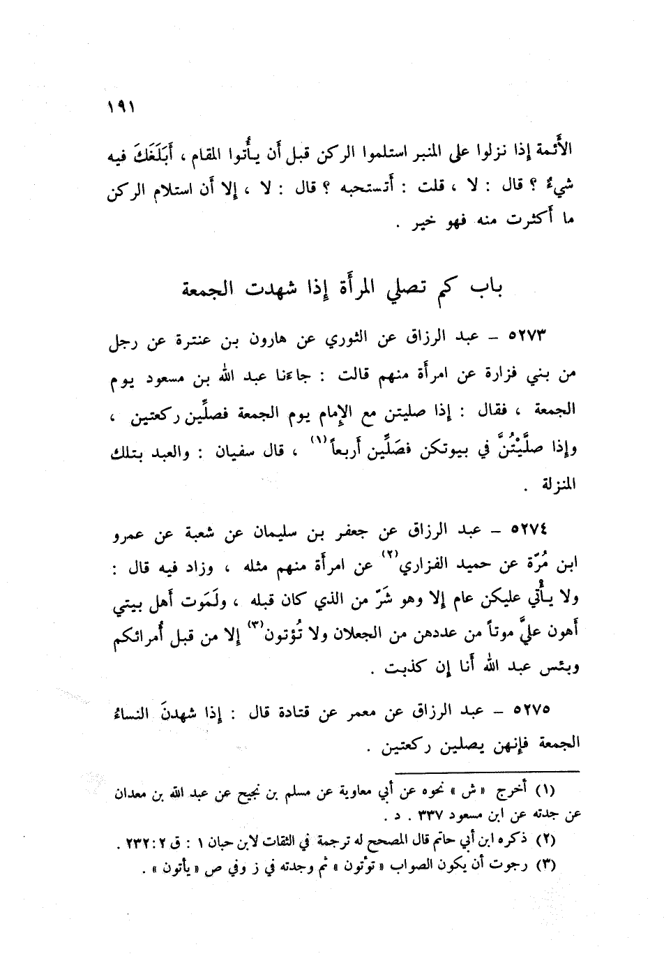 5273 - عَنِ الثَّوْرِيِّ، عَنْ هَارُونَ بْنِ عَنْتَرَةَ، عَنْ رَجُلٍ، مِنْ بَنِي فَزَارَةَ، عَنِ امْرَأَةٍ، مِنْهُمْ قَالَتْ: جَاءَنَا عَبْدُ اللَّهِ بْنُ مَسْعُودٍ يَوْمَ الْجُمُعَةِ، فَقَالَ: «§إِذَا صَلَّيْتُنَّ مَعَ الْإِمَامِ يَوْمَ الْجُمُعَةِ فَصَلِّينَ رَكْعَتَيْنِ، وَإِذَا صَلَّيْتُنَّ فِي بُيُوتِكُنَّ فَصَلِّينَ أَرْبَعًا» قَالَ سُفْيَانُ: وَالْعَبْدُ بِتِلْكَ الْمَنْزِلَةِ، عَبْدُ الرَّزَّاقِ،