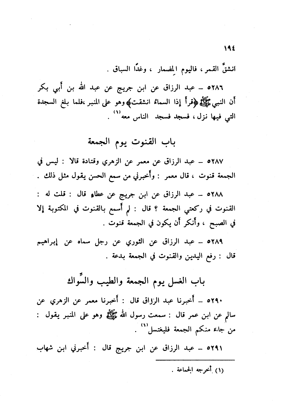 5290 - عَبْدُ الرَّزَّاقِ قَالَ: أَخْبَرَنَا مَعْمَرٌ، عَنِ الزُّهْرِيِّ، عَنْ سَالِمٍ، عَنِ ابْنِ عُمَرَ قَالَ: سَمِعْتُ رَسُولَ اللَّهِ صَلَّى اللهُ عَلَيْهِ وَسَلَّمَ وَهُوَ عَلَى الْمِنْبَرِ يَقُولُ: «§مَنْ جَاءَ مِنْكُمُ الْجُمُعَةَ فَلْيَغْتَسِلْ» عَبْدُ الرَّزَّاقِ،