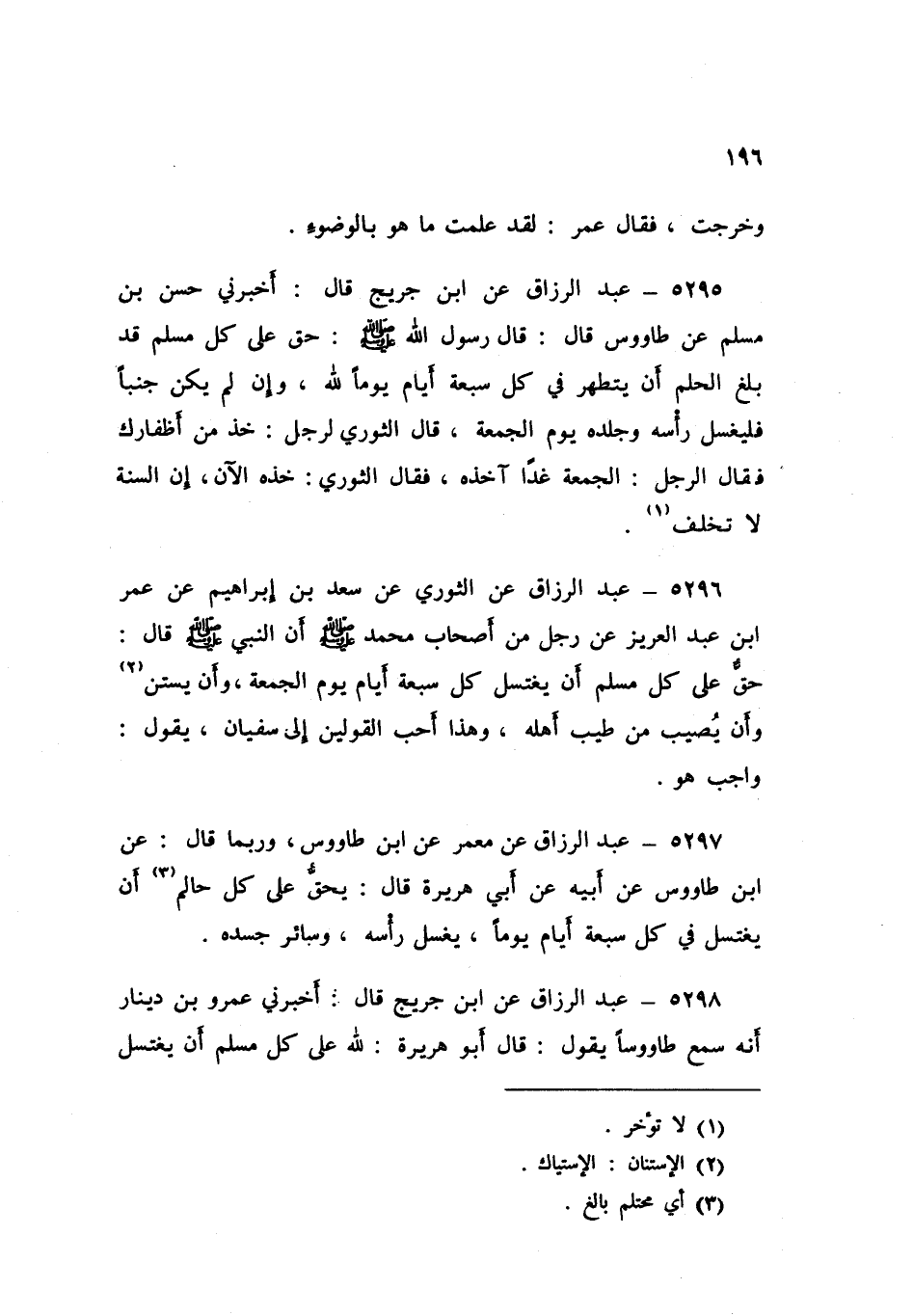 5297 - عَنْ مَعْمَرٍ، عَنِ ابْنِ طَاوُسٍ، وَرُبَّمَا قَالَ: عَنِ ابْنِ طَاوُسٍ، عَنْ أَبِيهِ، عَنْ أَبِي هُرَيْرَةَ قَالَ: «§يَحِقُّ عَلَى كُلِّ حَالِمٍ أَنْ يَغْتَسِلَ فِي كُلِّ سَبْعَةِ أَيَّامٍ يَوْمَا، يَغْسِلُ رَأْسَهُ، وَسَائِرَ جَسَدِهِ»