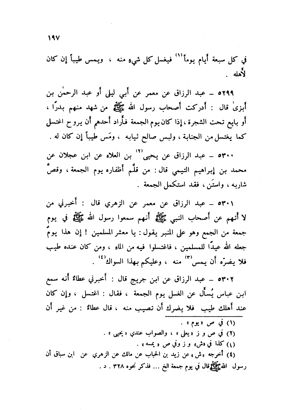 5301 - عَنْ مَعْمَرٍ، عَنِ الزُّهْرِيِّ قَالَ: أَخْبَرَنِي مَنْ، لَا أَتَّهِمُ، عَنْ أَصْحَابِ النَّبِيِّ صَلَّى اللهُ عَلَيْهِ وَسَلَّمَ أَنَّهُمْ سَمِعُوا رَسُولَ اللَّهِ صَلَّى اللهُ عَلَيْهِ وَسَلَّمَ فِي يَوْمِ جُمُعَةٍ مِنَ الْجُمَعِ، وَهُوَ عَلَى الْمِنْبَرِ يَقُولُ: «يَا §مَعْشَرَ الْمُسْلِمِينَ، إِنَّ هَذَا يَوْمٌ جَعَلَهُ اللَّهُ عِيدًا لِلْمُسْلِمِينَ فَاغْتَسِلُوا فِيهِ مِنَ الْمَاءِ، وَمَنْ كَانَ عِنْدَهُ طِيبٌ فَلَا يَضُرُّهُ أَنْ يَمَسَّ مِنْهُ، وَعَلَيْكُمْ بِهَذَا السِّوَاكِ»