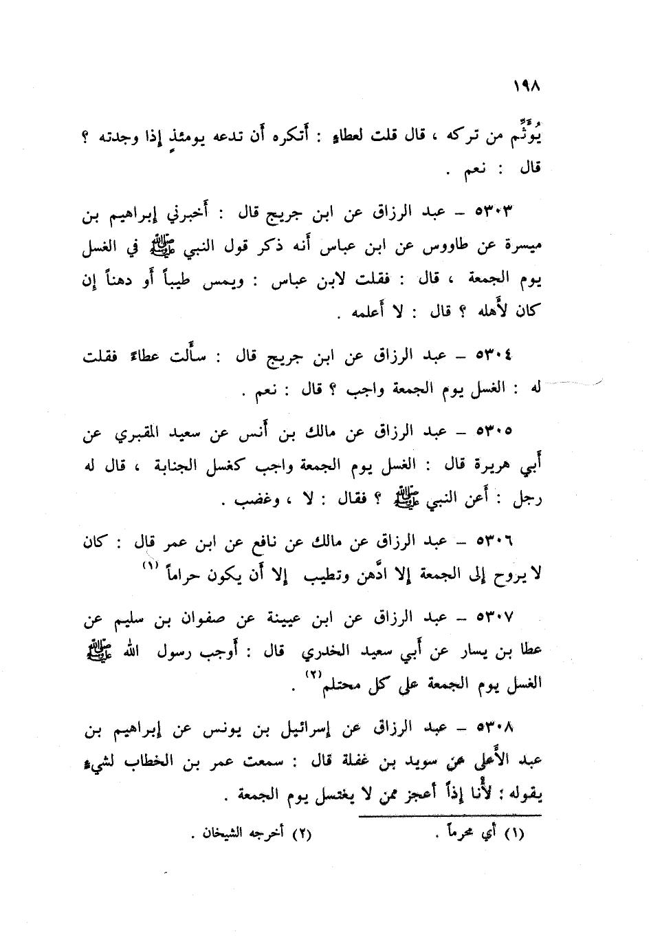 5304 - عَنِ ابْنِ جُرَيْجٍ قَالَ: سَأَلْتُ عَطَاءً فَقُلْتُ لَهُ: §الْغُسْلُ يَوْمَ الْجُمُعَةِ وَاجِبٌ؟ قَالَ: «نَعَمْ»