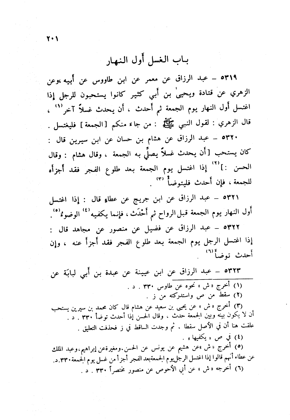 5319 - عَنْ مَعْمَرٍ، عَنِ ابْنِ طَاوُسٍ، عَنْ أَبِيهِ، وَعَنِ الزُّهْرِيِّ، عَنْ قَتَادَةَ، وَيَحْيَى بْنِ أَبِي كَثِيرٍ كَانُوا يَسْتَحِبُّونَ لِلرَّجُلِ إِذَا اغْتَسَلَ أَوَّلَ النَّهَارِ يَوْمَ الْجُمُعَةِ، ثُمَّ أَحْدَثَ أَنْ يُحْدِثَ غُسْلًا آخَرَ، قَالَ الزُّهْرِيُّ: لِقَوْلِ النَّبِيِّ صَلَّى اللهُ عَلَيْهِ وَسَلَّمَ: «§مَنْ جَاءَ مِنْكُمُ الْجُمُعَةَ فَلْيَغْتَسِلْ»