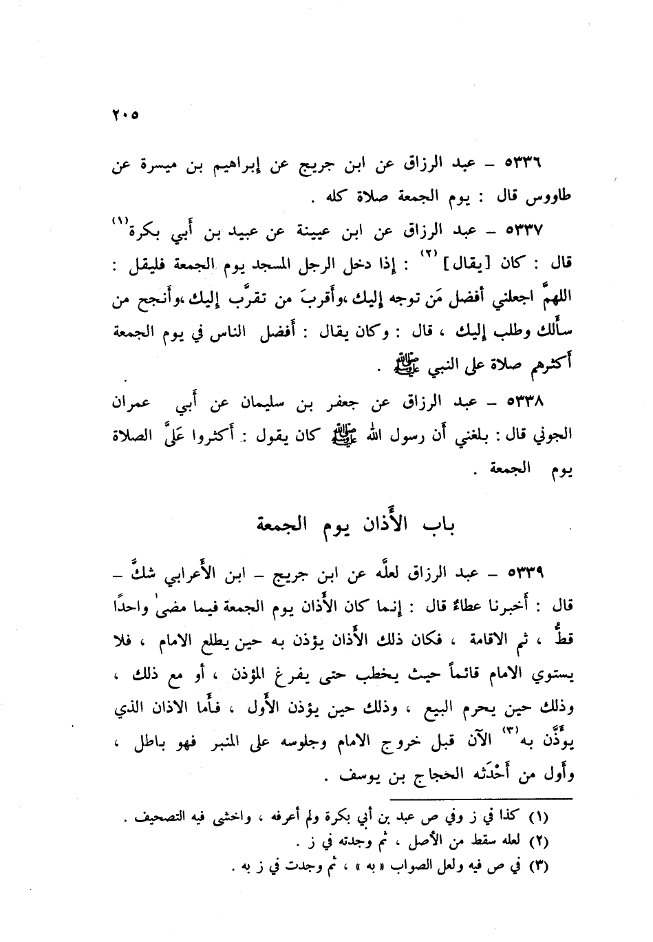 5339 - لَعَلَّهُ عَنِ ابْنِ جُرَيْجٍ أَوِ ابْنِ الْأَعْرَابِيِّ شَكَّ قَالَ: أَخْبَرَنَا عَطَاءٌ قَالَ: «§إِنَّمَا كَانَ الْأَذَانُ يَوْمَ الْجُمُعَةِ فِيمَا مَضَى وَاحِدًا قَطُّ ثُمَّ الْإِقَامَةُ، فَكَانَ ذَلِكَ الْأَذَانُ يُؤَذَّنُ بِهِ حِينَ يَطْلُعُ الْإِمَامُ فَلَا يَسْتَوِي الْإِمَامُ قَائِمًا حَيْثُ يَخْطُبُ حَتَّى يَفْرُغَ الْمُؤَذِّنُ أَوْ مَعَ ذَلِكَ، وَذَلِكَ حِينَ يَحْرُمُ الْبَيْعُ، وَذَلِكَ حِينَ يُؤَذِّنُ الْأَوَّلُ، فَأَمَّا الْأَذَانُ الَّذِي يُؤَذَّنُ بِهِ الْآنَ قَبْلَ خُرُوجِ الْإِمَامِ وَجُلُوسِهِ عَلَى الْمِنْبَرِ فَهُوَ بَاطِلٌ»، وَأَوَّلُ مَنْ أَحْدَثَهُ الْحَجَّاجُ بْنُ يُوسُفَ