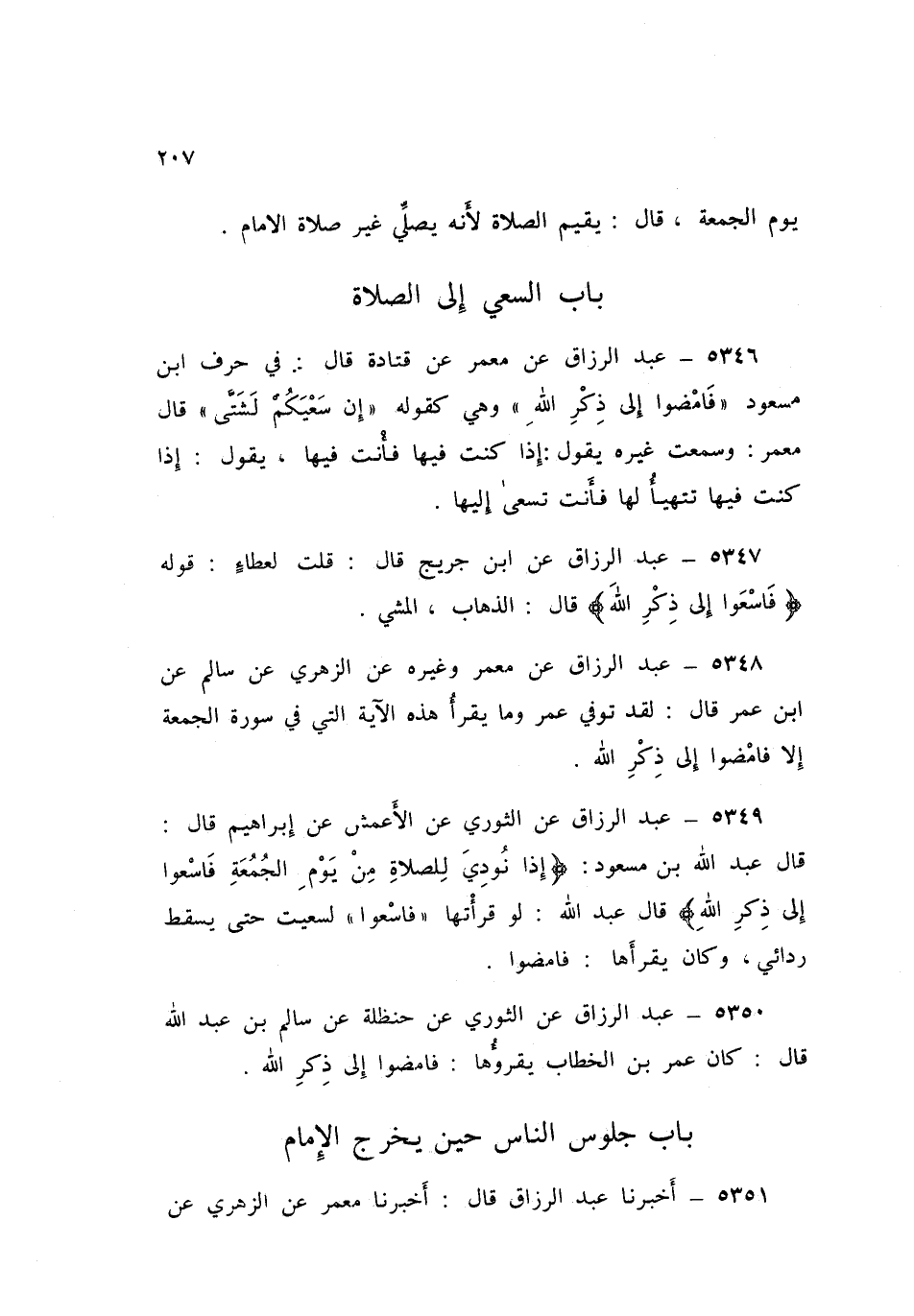 5348 - عَنْ مَعْمَرٍ، وَغَيْرِهِ، عَنِ الزُّهْرِيِّ، عَنْ سَالِمٍ، عَنِ ابْنِ عُمَرَ قَالَ: §لَقَدْ تُوُفِّيَ عُمَرُ، وَمَا يَقْرَأُ هَذِهِ الْآيَةَ الَّتِي فِي سُورَةِ الْجُمُعَةِ إِلَّا: فَامْضُوا إِلَى ذِكْرِ اللَّهِ
