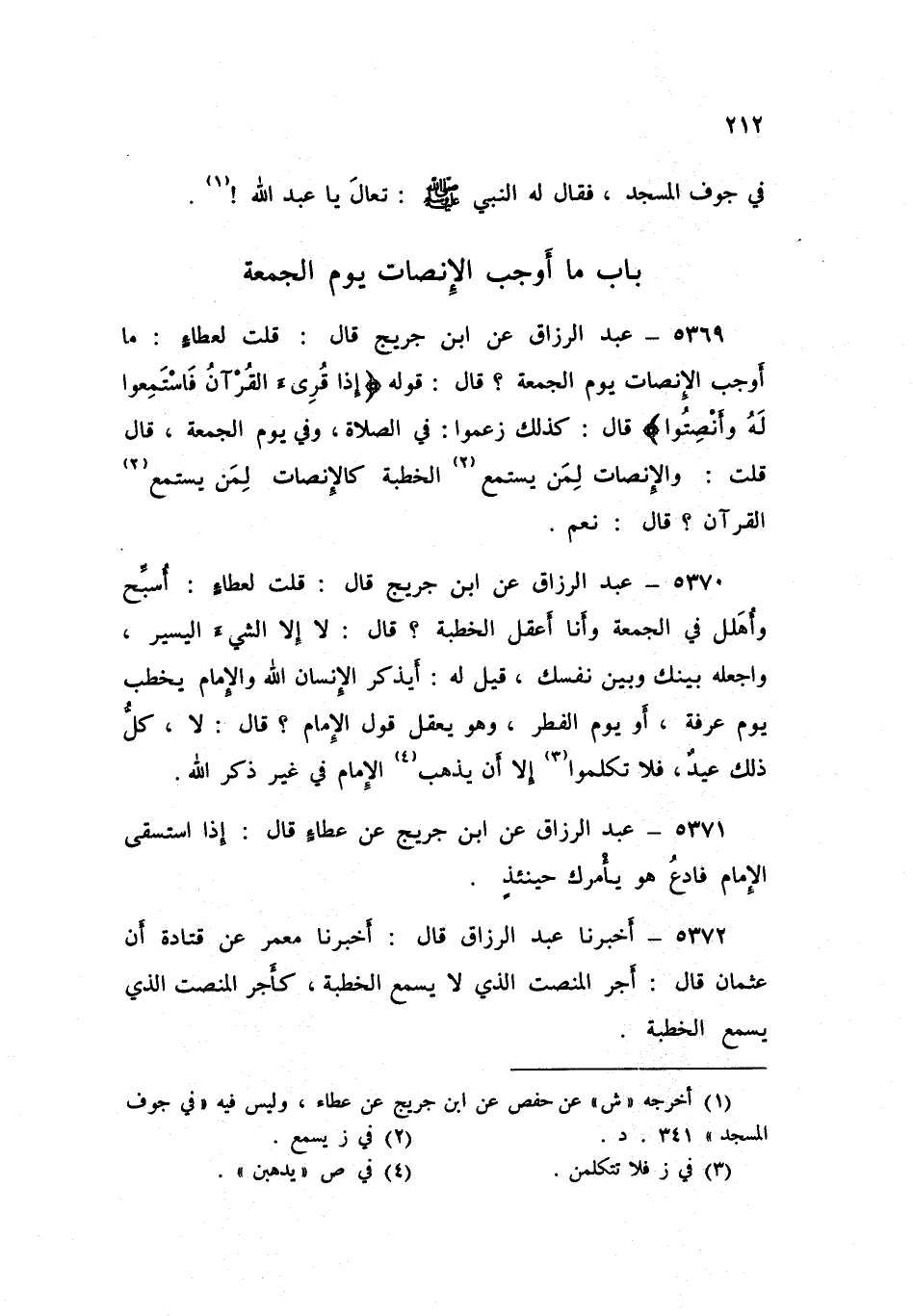 5369 - عَنِ ابْنِ جُرَيْجٍ قَالَ: قُلْتُ لِعَطَاءٍ: §مَا أَوْجَبَ الْإِنْصَاتَ يَوْمَ الْجُمُعَةِ؟ قَالَ: قَوْلُهُ: {إِذَا قُرِئَ الْقُرْآنُ فَاسْتَمِعُوا لَهُ وَأَنْصِتُوا} [الأعراف: 204] قَالَ: «كَذَلِكَ زَعَمُوا فِي الصَّلَاةِ وَفِي يَوْمِ الْجُمُعَةِ» قَالَ: قُلْتُ: وَالْإِنْصَاتُ لِمَنْ يَسْتَمِعُ الْخُطْبَةَ كَالْإِنْصَاتِ لِمَنْ يَسْتَمِعُ الْقُرْآنَ؟ قَالَ: «نَعَمْ»