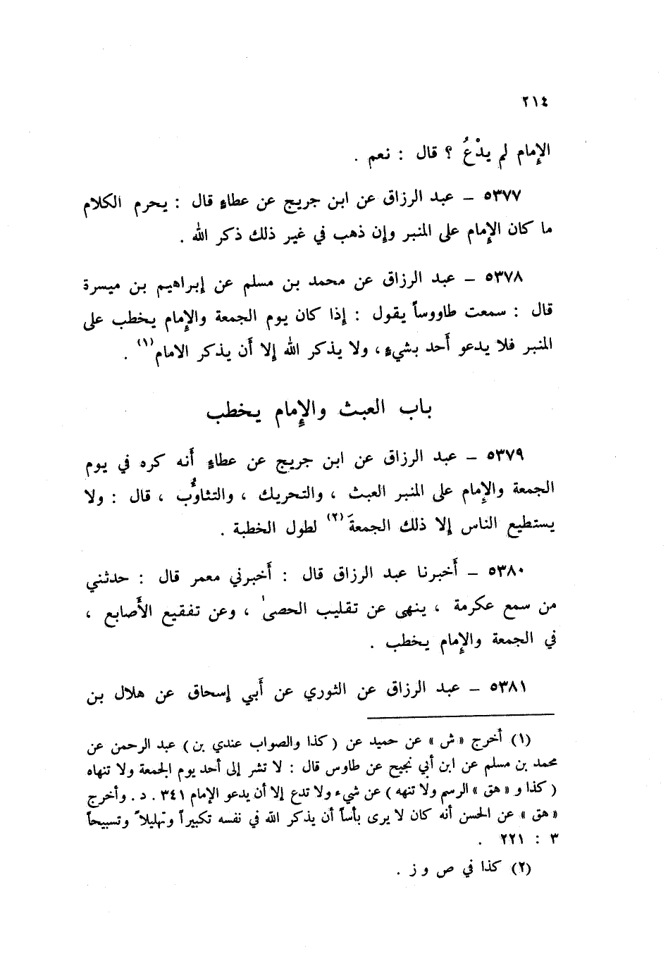 5379 - عَنِ ابْنِ جُرَيْجٍ، عَنْ عَطَاءٍ أَنَّهُ §كَرِهَ فِي يَوْمِ الْجُمُعَةِ، وَالْإِمَامُ عَلَى الْمِنْبَرِ الْعَبَثَ وَالتَّحْرِيكَ وَالتَّثَاؤُبَ قَالَ: «وَلَا يَسْتَطِيعُ النَّاسُ إِلَّا ذَلِكَ الْجُمُعَةَ لِطُولِ الْخُطْبَةِ»