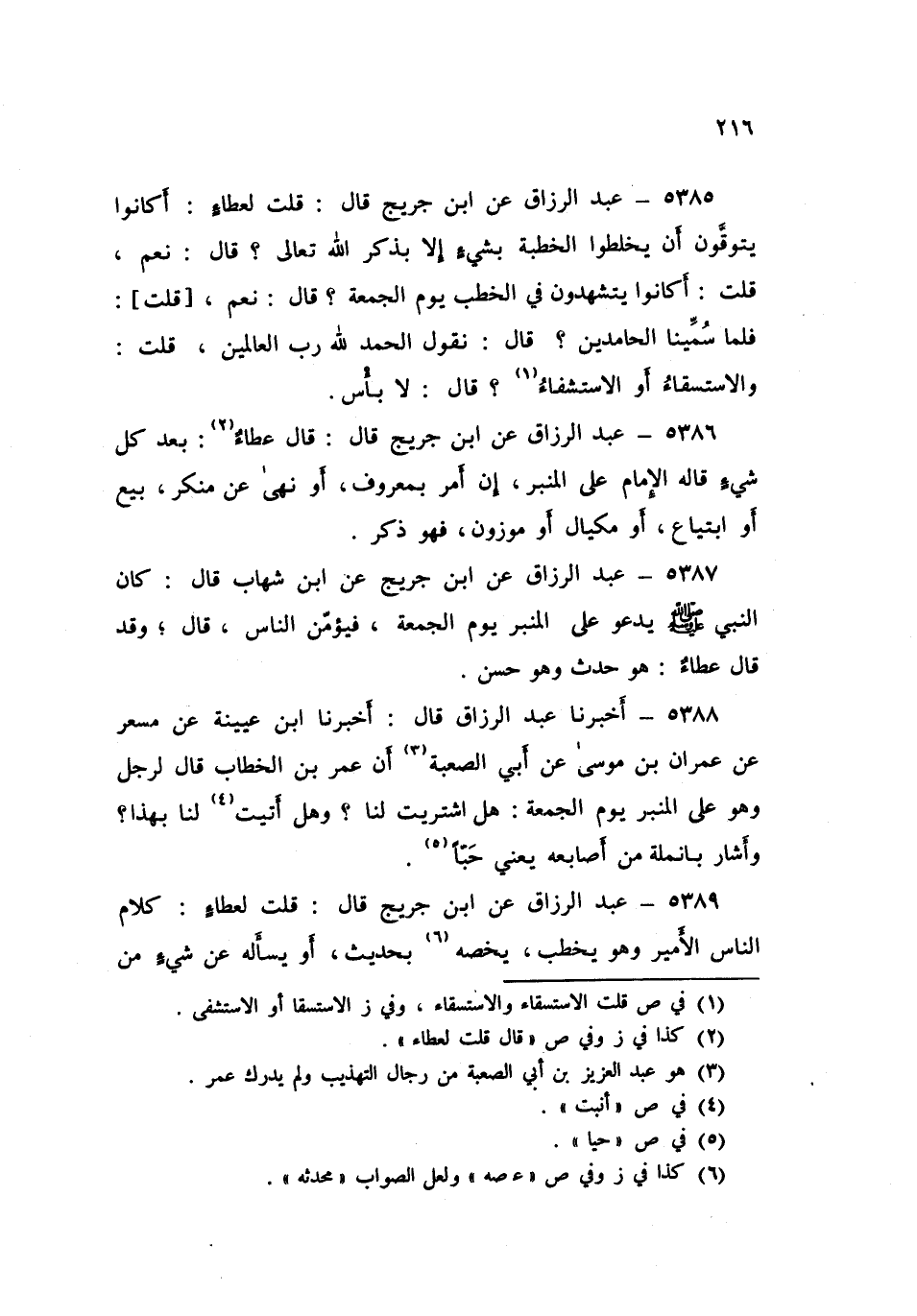 5389 - عَنِ ابْنِ جُرَيْجٍ قَالَ: قُلْتُ لِعَطَاءٍ: كَلَامُ النَّاسِ الْأَمِيرَ، وَهُوَ يَخْطُبُ يَخُصُّهُ بِحَدِيثٍ أَوْ يَسْأُلُهُ عَنْ شَيْءٍ مِنَ الذِّكْرِ؟ قَالَ: «§أَكْرَهُ ذَلِكَ» قَالَ: قُلْتُ: فَكَلَامُ النَّاسِ الْإِمَامَ، وَهُوَ عَلَى الْمِنْبَرِ يُثْنُونَ عَلَيْهِ؟ قَالَ: «وَأَكْرَهُهُ، إِنَّمَا الْجُمُعَةُ ذِكْرٌ»