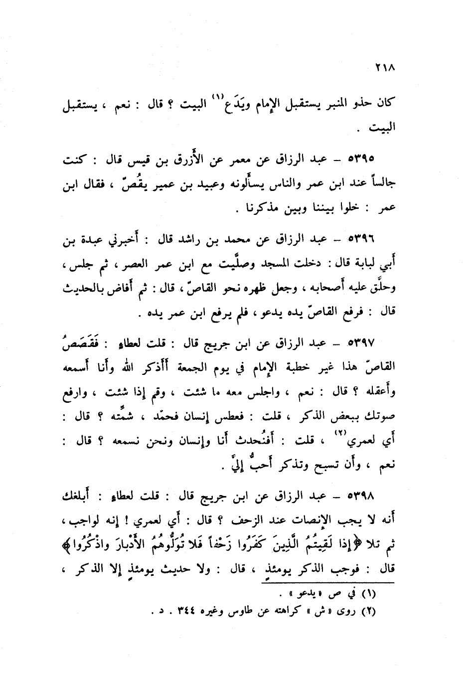 5397 - عَنِ ابْنِ جُرَيْجٍ قَالَ: قُلْتُ لِعَطَاءٍ: §فَقَصَصُ الْقَاصِّ هَذَا غَيْرُ خُطْبَةِ الْإِمَامِ فِي يَوْمِ الْجُمُعَةِ أَأَذْكُرُ اللَّهَ وَأَنَا أَسْمَعُهُ وَأَعْقِلُهُ؟ قَالَ: «نَعَمْ، وَاجْلِسْ مَعَهُ مَا شِئْتَ وَقُمْ إِذَا شِئْتَ وَارْفَعْ صَوْتَكَ بِبَعْضِ الذِّكْرِ»، قُلْتُ: فَعَطَسَ إِنْسَانٌ فَحَمِدَ، شَمِّتْهُ؟ قَالَ: «أَيْ لَعَمْرِي» قُلْتُ: أَفَنُحَدِّثُ أَنَا وَإِنْسَانٌ وَنَحْنُ نَسْمَعُهُ؟ قَالَ: «نَعَمْ، وَأَنْ تُسَبِّحَ وَتَذْكُرَ أَحَبُّ إِلَيَّ»