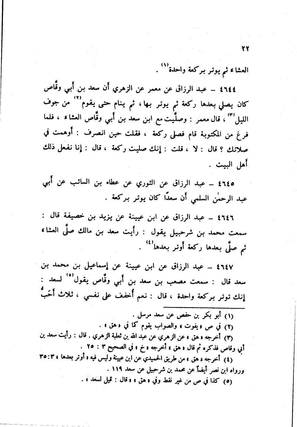 4645 - عَنِ الثَّوْرِيِّ، عَنْ عَطَاءِ بْنِ السَّائِبِ، عَنْ أَبِي عَبْدِ الرَّحْمَنِ السُّلَمِيِّ: أَنَّ سَعْدًا «كَانَ §يُوتِرُ بِرَكْعَةٍ»