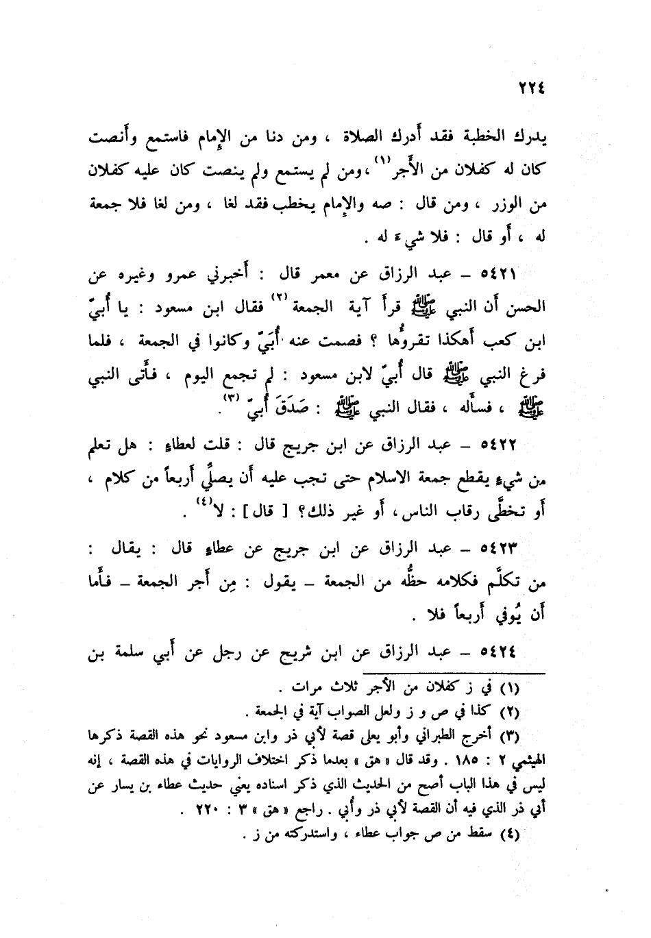 5423 - عَنِ ابْنِ جُرَيْجٍ، عَنْ عَطَاءٍ قَالَ: يُقَالُ: «§مَنْ تَكَلَّمَ فَكَلَامُهُ حَظُّهُ مِنَ الْجُمُعَةِ» يَقُولُ: مِنْ أَجْرِ الْجُمُعَةِ، فَأَمَّا أَنْ يُوَفِّيَ أَرْبَعًا فَلَا