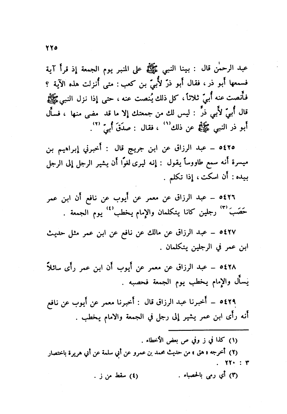 5428 - عَنْ مَعْمَرٍ، عَنْ أَيُّوبَ أَنَّ ابْنَ عُمَرَ، «§رَأَى سَائِلًا يَسْأَلُ، وَالْإِمَامُ يَخْطُبُ يَوْمَ الْجُمُعَةِ فَحَصَبَهُ»