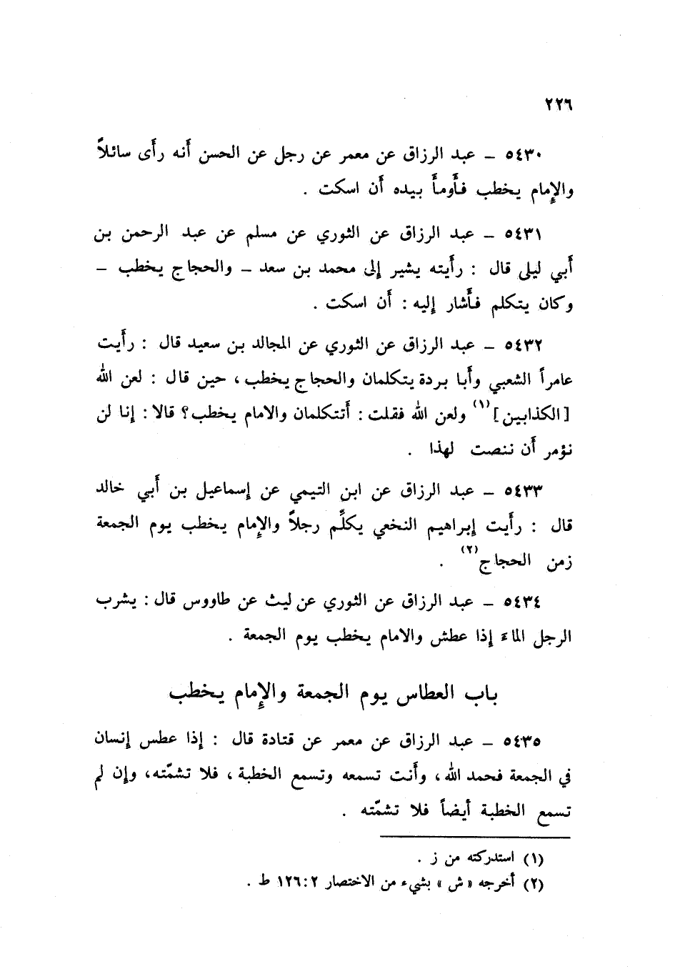 5433 - عَنِ ابْنِ التَّيْمِيِّ، عَنْ إِسْمَاعِيلَ بْنِ أَبِي خَالِدٍ قَالَ: رَأَيْتُ إِبْرَاهِيمَ النَّخَعِيَّ «§يُكَلِّمُ رَجُلًا، وَالْإِمَامُ يَخْطُبُ يَوْمَ الْجُمُعَةِ زَمَنَ الْحَجَّاجِ»