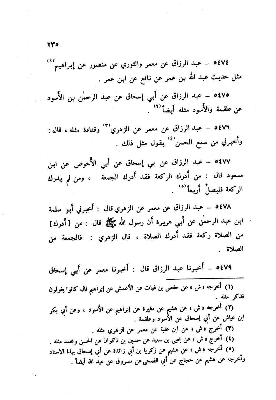 5477 - عَنْ أَبِي إِسْحَاقَ، عَنْ أَبِي الْأَحْوَصِ، عَنِ ابْنِ مَسْعُودٍ قَالَ: «§مَنْ أَدْرَكَ الرَّكْعَةَ فَقَدْ أَدْرَكَ الْجُمُعَةَ، وَمَنْ لَمْ يُدْرِكِ الرَّكْعَةَ فَلْيُصَلِّ أَرْبَعًا»