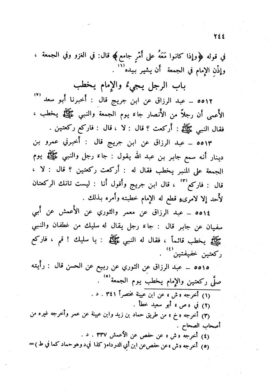 5513 - عَنِ ابْنِ جُرَيْجٍ قَالَ: أَخْبَرَنِي عَمْرُو بْنُ دِينَارٍ، أَنَّهُ سَمِعَ جَابِرَ بْنَ عَبْدِ اللَّهِ يَقُولُ: جَاءَ رَجُلٌ وَالنَّبِيُّ صَلَّى اللهُ عَلَيْهِ وَسَلَّمَ يَوْمَ الْجُمُعَةِ عَلَى الْمِنْبَرِ يَخْطُبُ فَقَالَ لَهُ: «§أَرَكَعْتَ رَكْعَتَيْنِ؟» قَالَ: لَا قَالَ: «فَارْكَعْ»، قَالَ ابْنُ جُرَيْجٍ: وَأَقُولُ أَنَا: لَيْسَتْ تَانِكَ الرَّكْعَتَانِ لِأَحَدٍ إِلَّا لِامْرِئٍ قَطَعَ لَهُ الْإِمَامُ خُطْبَتَهُ وَأَمَرَهُ بِذَلِكَ