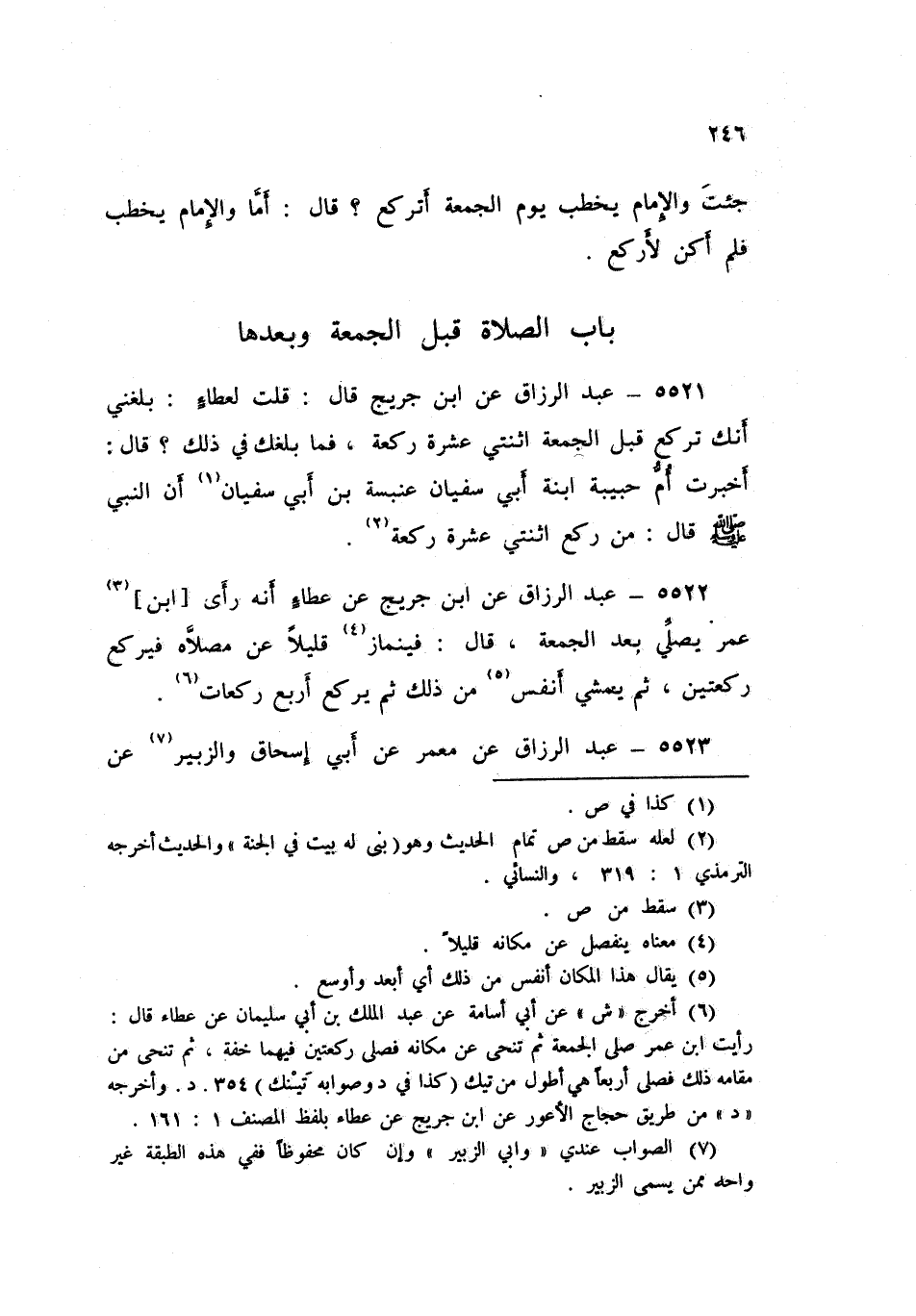5521 - عَنِ ابْنِ جُرَيْجٍ قَالَ: قُلْتُ لِعَطَاءٍ: بَلَغَنِي أَنَّكَ تَرْكَعُ قَبْلَ الْجُمُعَةِ اثْنَتَيْ عَشْرَةَ رَكْعَةً، فَمَا بَلَغَكَ فِي ذَلِكَ؟ قَالَ: أَخْبَرَتْ أُمُّ حَبِيبَةَ ابْنَةُ أَبِي سُفْيَانَ عَنْبَسَةَ بْنَ أَبِي سُفْيَانَ أَنَّ النَّبِيَّ صَلَّى اللهُ عَلَيْهِ وَسَلَّمَ قَالَ: «§مَنْ رَكَعَ اثْنَتَيْ عَشْرَةَ رَكْعَةً»