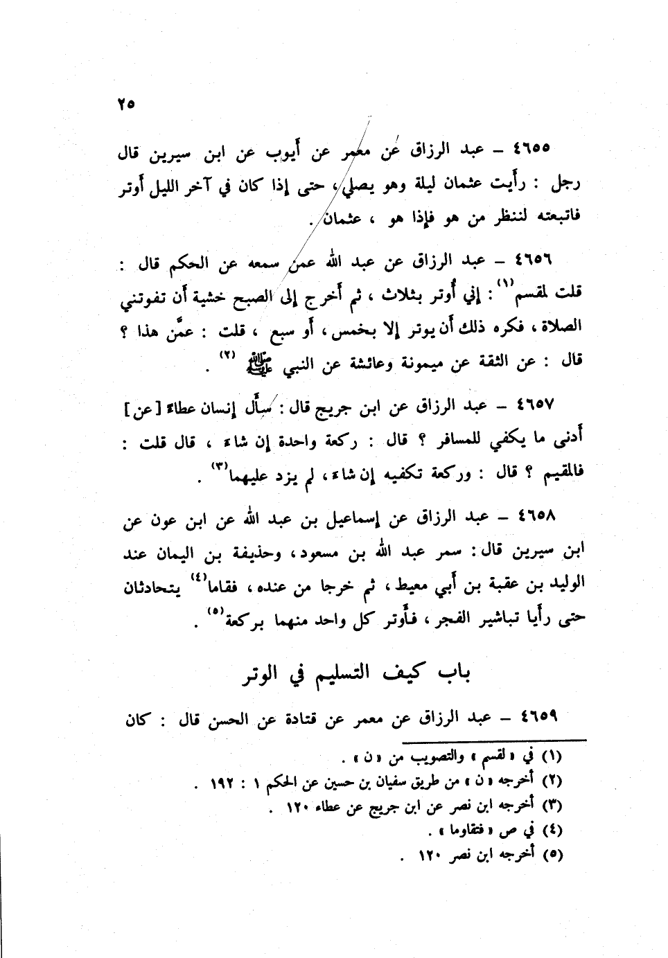 4659 - عَنْ مَعْمَرٍ، عَنْ قَتَادَةَ، عَنِ الْحَسَنِ قَالَ: «كَانَ أُبَيُّ بْنُ كَعْبٍ §يُوتِرُ بِثَلَاثٍ لَا يُسَلِّمُ إِلَّا فِي الثَّالِثَةِ مِثْلَ الْمَغْرِبِ»، عَبْدُ الرَّزَّاقِ،