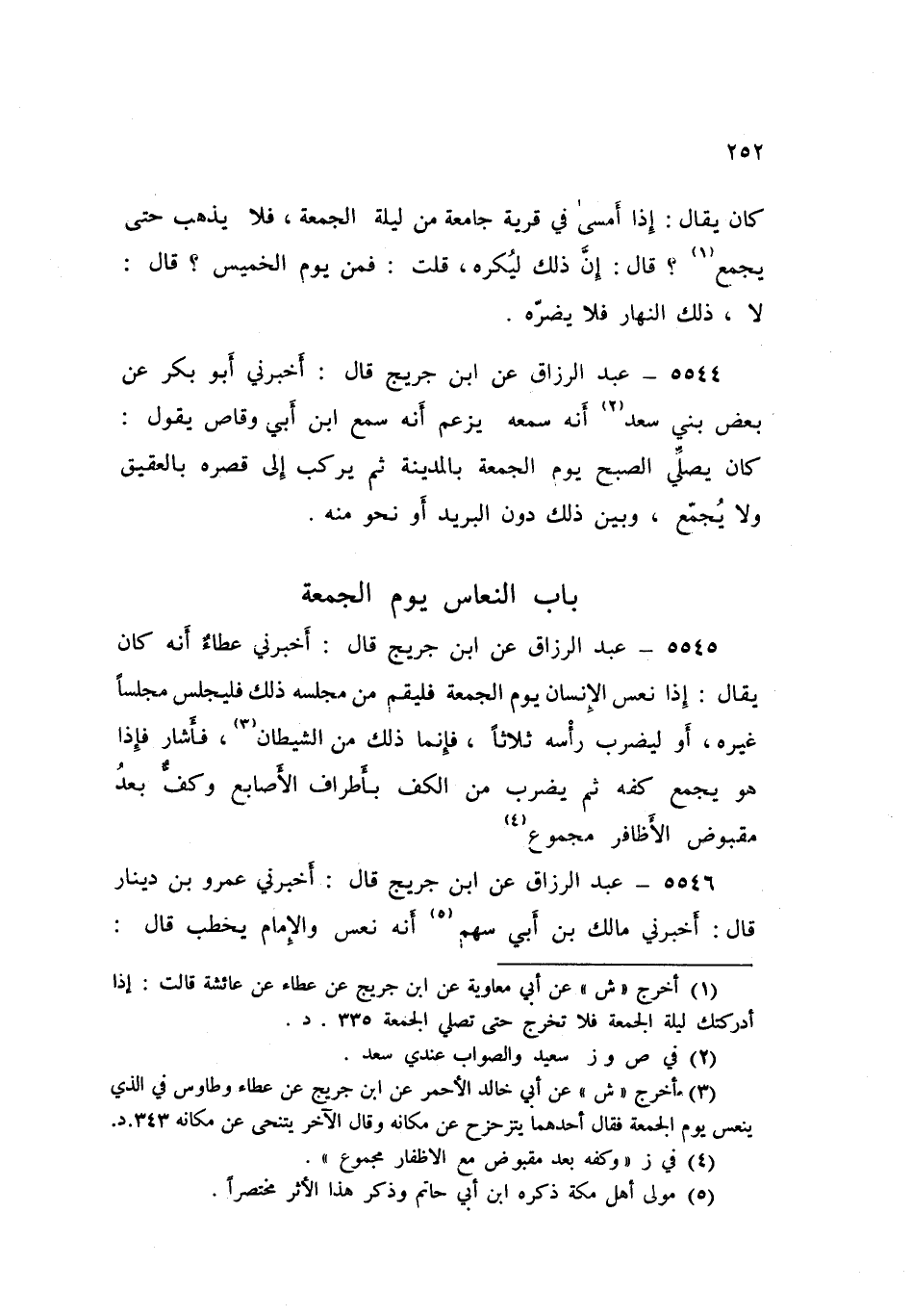 5545 - عَنِ ابْنِ جُرَيْجٍ قَالَ: أَخْبَرَنِي عَطَاءٌ، أَنَّهُ كَانَ يُقَالُ: «§إِذَا نَعَسَ الْإِنْسَانُ يَوْمَ الْجُمُعَةِ فَلْيَقُمْ مِنْ مَجْلِسِهِ، ذَلِكَ فْلَيَجْلِسْ مَجْلِسًا غَيْرَهُ، أَوْ لِيَضْرِبْ رَأْسَهُ ثَلَاثًا، فَإِنَّمَا ذَلِكَ مِنَ الشَّيْطَانِ، فَأَشَارَ فَإِذَا هُوَ يَجْمَعُ كَفَّهُ، ثُمَّ يْضَرِبُ مِنَ الْكَفِّ بِأَطْرَافِ الْأَصَابِعِ، وَكَفٌّ بَعْدُ مَقْبُوضُ الْأَظَافِرِ مْجَمُوعٌ»