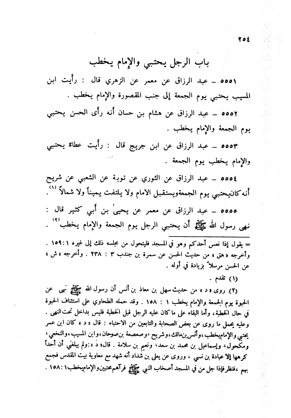 5555 - عَنْ مَعْمَرٍ، عَنْ يَحْيَى بْنِ أَبِي كَثِيرٍ قَالَ: «§نَهَى رَسُولُ اللَّهِ صَلَّى اللهُ عَلَيْهِ وَسَلَّمَ أَنْ يَحْتَبِيَ الرَّجُلُ يَوْمَ الْجُمُعَةِ، وَالْإِمَامُ يَخْطُبُ»