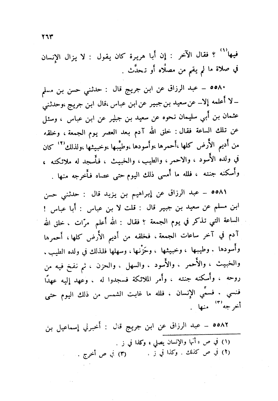 5581 - عَنْ إِبْرَاهِيمَ بْنِ يَزِيدَ قَالَ: حَدَّثَنِي حَسَنُ بْنُ مُسْلِمٍ، عَنْ سَعِيدِ بْنِ جُبَيْرٍ قَالَ: قُلْتُ لِابْنِ عَبَّاسٍ: أَبَا عَبَّاسٍ، السَّاعَةُ الَّتِي تُذْكَرُ فِي يَوْمِ الْجُمُعَةِ؟ فَقَالَ: «اللَّهُ أَعْلَمُ مَرَّاتٍ، §خَلَقَ اللَّهُ آدَمَ فِي آخِرِ سَاعَاتِ الْجُمُعَةِ، فَخَلَقَهُ مِنْ أَدِيمِ الْأَرْضِ كُلِّهَا أَحْمَرِهَا وَأَسْوَدِهَا وَطَيِّبِهَا وَخَبِيثِهَا وَحَزْنِهَا وَسَهْلِهَا، فَلِذَلِكَ فِي وَلَدِهِ الطَّيِّبُ وَالْخَبِيثُ وَالْأَحْمَرُ وَالْأَسْوَدُ وَالسَّهْلُ وَالْحَزْنُ، ثُمَّ نَفَخَ فِيهِ مِنْ رُوحِهِ، وَأَسْكَنَهُ جَنَّتَّهُ، وَأَمَرَ الْمَلَائِكَةَ فَسَجَدُوا لَهُ، وَعَهِدَ إِلَيْهِ عَهْدًا فَنَسِيَ فَسُمِّيَ الْإِنْسَانَ، فَلِلَّهِ مَا غَابَتِ الشَّمْسُ مِنْ ذَلِكَ الْيَوْمِ حَتَّى أَخْرَجَهُ مِنْهَا»