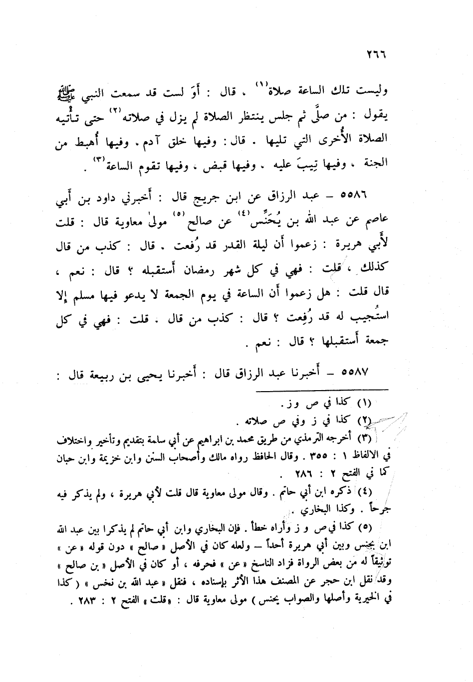5586 - عَنِ ابْنِ جُرَيْجٍ قَالَ: أَخْبَرَنِي دَاوُدُ بْنُ أَبِي عَاصِمٍ، عَنْ عَبْدِ اللَّهِ بْنِ يُحَنِّسَ، عَنْ صَالِحٍ، مَوْلَى مُعَاوِيَةَ قَالَ: قُلْتُ لِأَبِي هُرَيْرَةَ: زَعَمُوا أَنَّ لَيْلَةَ الْقَدْرِ قَدْ رُفِعَتْ قَالَ: «كَذَبَ مَنْ قَالَ كَذَلِكَ؟»، قُلْتُ: فَهِيَ فِي كُلِّ شَهْرِ رَمَضَانَ أَسْتَقْبِلُهُ؟ قَالَ: «نَعَمْ» قَالَ: قُلْتُ: هَلْ زَعَموا أَنَّ السَّاعَةَ فِي §يَوْمِ الْجُمُعَةِ لَا يَدْعُو فِيهَا مُسْلِمٌ إِلَّا اسْتُجِيبَ لَهُ قَدْ رُفِعَتْ؟ قَالَ: «كَذَبَ مَنْ قَالَ»، قُلْتُ: فَهِيَ فِي كُلِّ جُمُعَةٍ أَسْتَقْبِلُهَا؟ قَالَ: «نَعَمْ»
