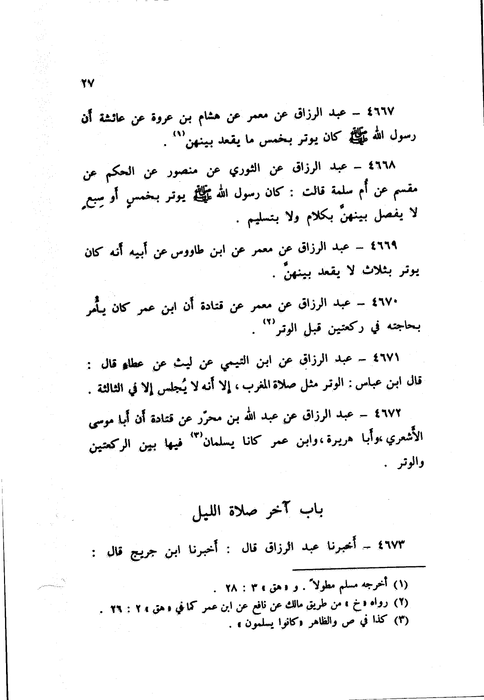 4669 - عَنْ مَعْمَرٍ، عَنِ ابْنِ طَاوُسٍ، عَنْ أَبِيهِ: أَنَّهُ كَانَ «§يُوتِرُ بِثَلَاثٍ لَا يَقْعُدُ بَيْنَهُنَّ»