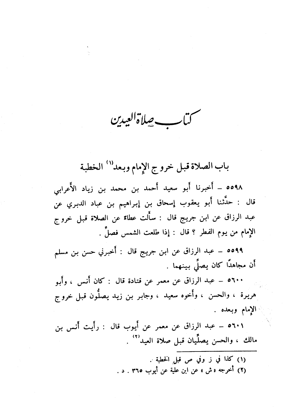 5598 - أَخْبَرَنَا أَبُو سَعِيدٍ أَحْمَدُ بْنُ مُحَمَّدِ بْنِ زِيَادٍ الْأَعْرَابِيُّ قَالَ: حَدَّثَنَا أَبُو يَعْقُوبَ إِسْحَاقُ بْنُ إِبْرَاهِيمَ بْنِ عَبَّادٍ الدَّبَرِيُّ، عَنْ عَبْدِ الرَّزَّاقِ، عَنِ ابْنِ جُرَيْجٍ قَالَ: سَأَلْتُ عَطَاءً عَنِ الصَّلَاةِ قَبْلَ خُرُوجِ الْإِمَامِ مِنْ يَوْمِ الْفِطْرِ قَالَ: «§إِذَا طَلَعَتِ الشَّمْسُ فَصَلِّ». عَبْدُ الرَّزَّاقِ،