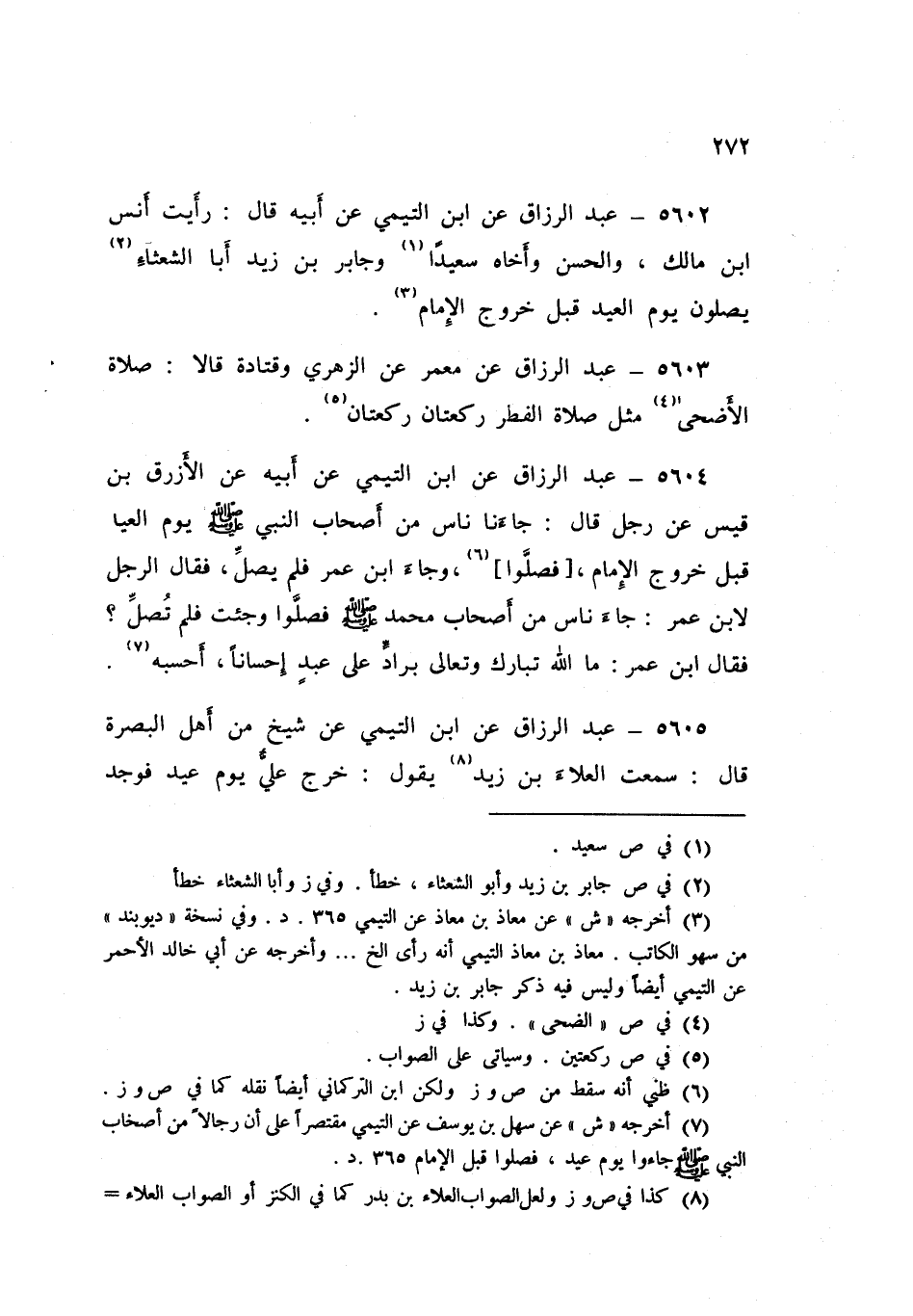 5604 - عَنِ ابْنِ التَّيْمِيِّ، عَنْ أَبِيهِ، عَنِ الْأَزْرَقِ بْنِ قَيْسٍ، عَنْ رَجُلٍ قَالَ: جَاءَنَا نَاسٌ مِنْ أَصْحَابِ النَّبِيِّ صَلَّى اللهُ عَلَيْهِ وَسَلَّمَ، يَوْمَ الْعِيدِ قَبْلَ خُرُوجِ الْإِمَامِ فَصَلَّوْا، وَجَاءَ ابْنُ عُمَرَ، فَلَمْ يُصَلِّ، فَقَالَ الرَّجُلُ لِابْنِ عُمَرَ: جَاءَ نَاسٌ مِنْ أَصْحَابِ مُحَمَّدٍ صَلَّى اللهُ عَلَيْهِ وَسَلَّمَ، فَصَلَّوْا، وَجِئْتَ فَلَمْ تُصَلِّ، فَقَالَ ابْنُ عُمَرَ: «§مَا اللَّهُ تَبَارَكَ وَتَعَالَى بِرَادٍّ عَلَى عَبْدٍ إَحْسَانًا، أَحْسِبُهُ»