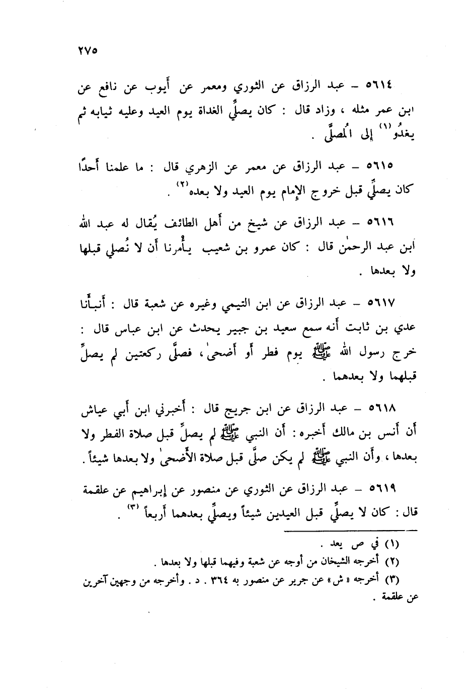 5619 - عَنِ الثَّوْرِيِّ، عَنْ مَنْصُورٍ، عَنْ إِبْرَاهِيمَ، عَنْ عَلْقَمَةَ قَالَ: «كَانَ §لَا يُصَلِّي قَبْلَ الْعِيدَيْنِ شَيْئًا وَيُصَلِّي بَعْدَهُمَا أَرْبَعًا»