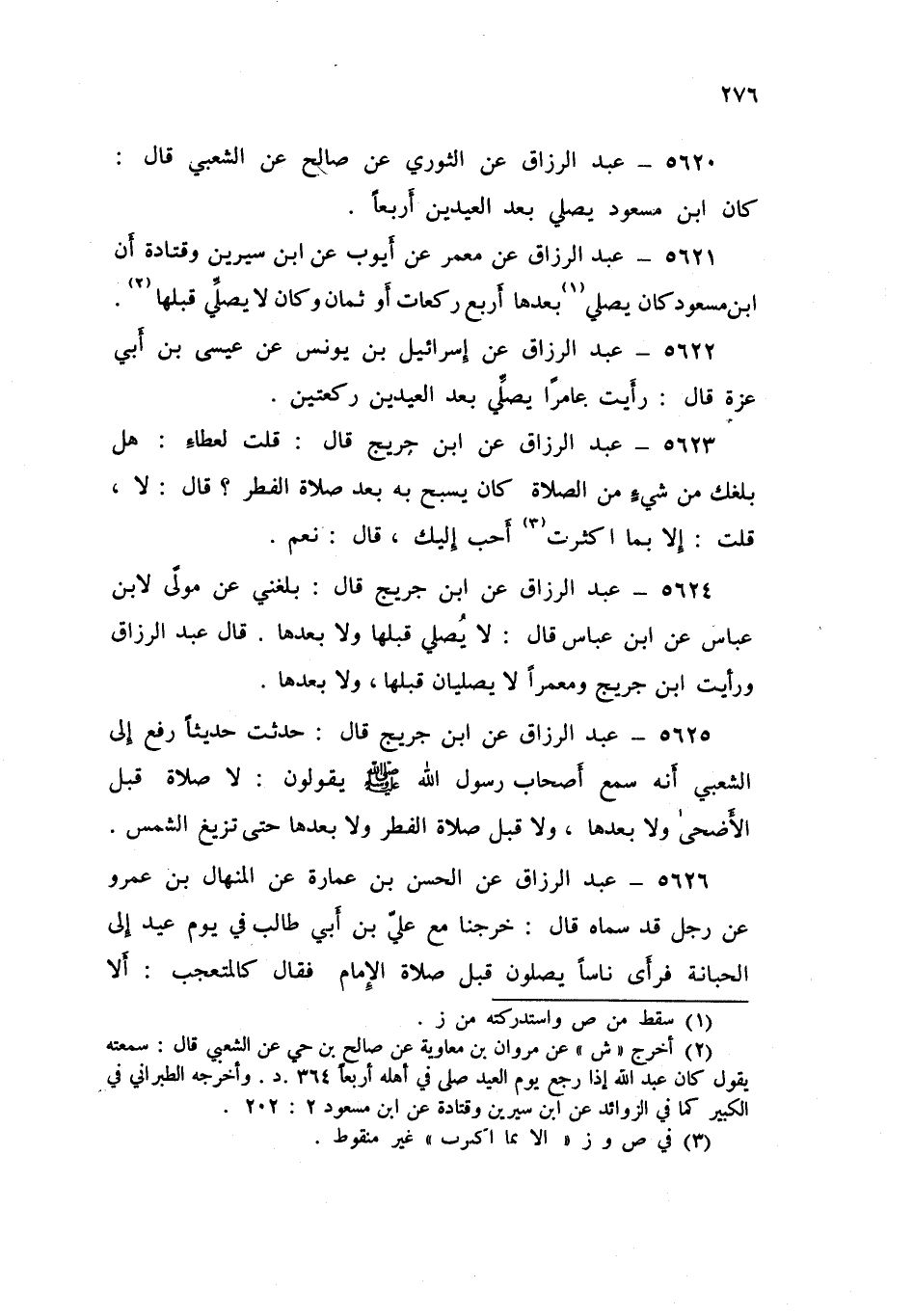 5623 - عَنِ ابْنِ جُرَيْجٍ قَالَ: قُلْتُ لِعَطَاءٍ: «هَلْ بَلَغَكَ مِنْ شَيءٍ مِنَ الصَّلَاةِ كَانَ §يُسَبَّحُ بِهِ بَعْدَ صَلَاةِ الْفِطْرِ؟» قَالَ: لَا، قُلْتُ: «إِلَّا بِمَا أَكْثَرْتَ أَحَبُّ إِلَيْكَ؟» قَالَ: نَعَمْ